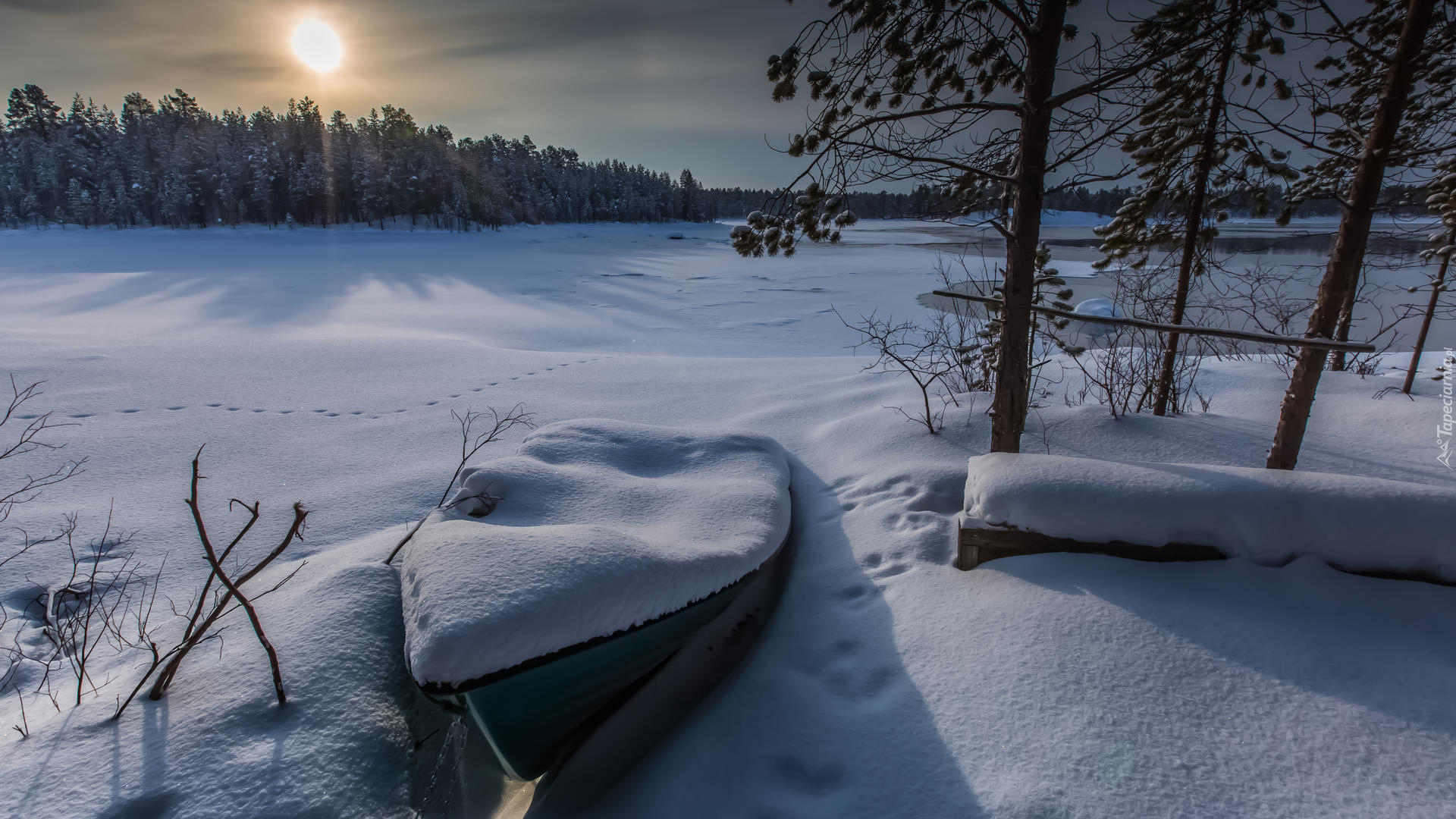 Edytor tapety: Łódka nad jeziorem zasypana śniegiem