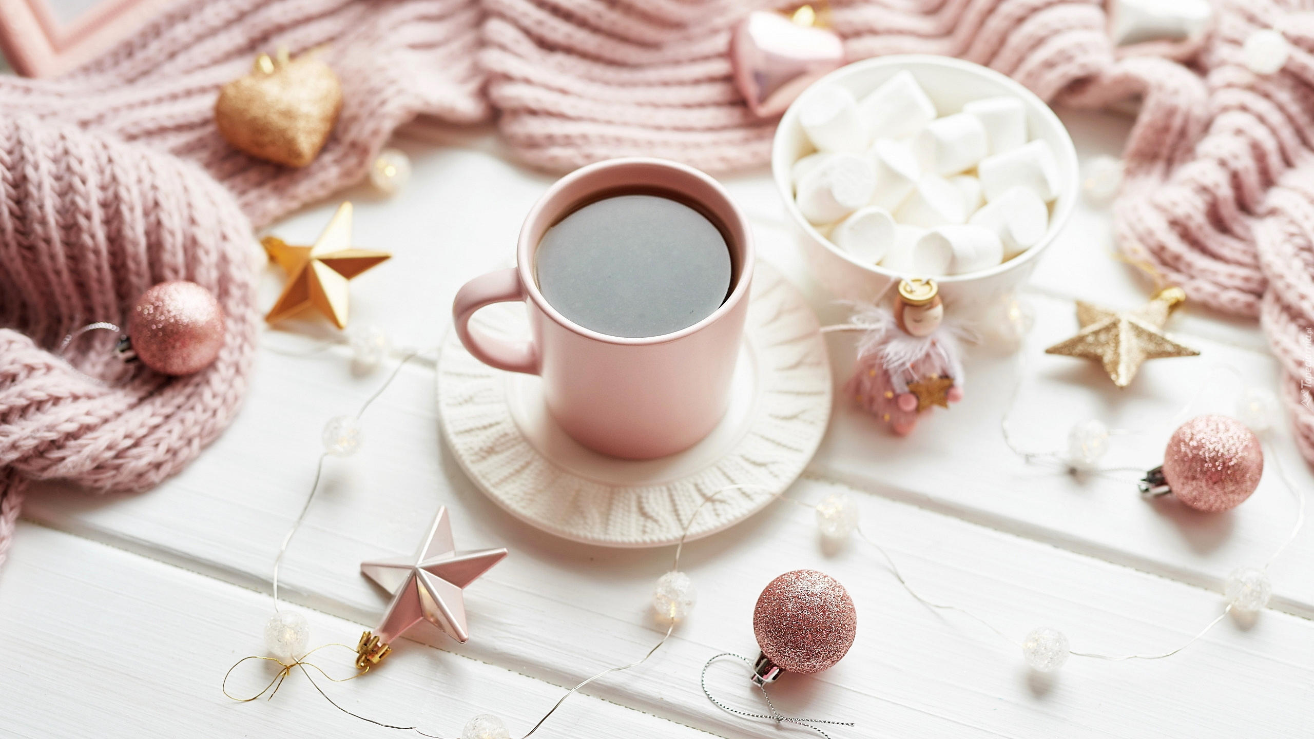 Edytor tapety: Kubek kawy obok miseczki z piankami