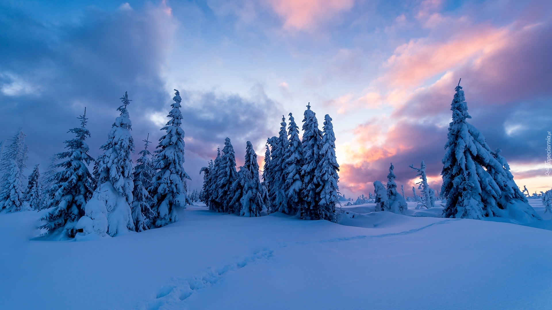 Edytor tapety: Ośnieżone świerki w blasku słońca