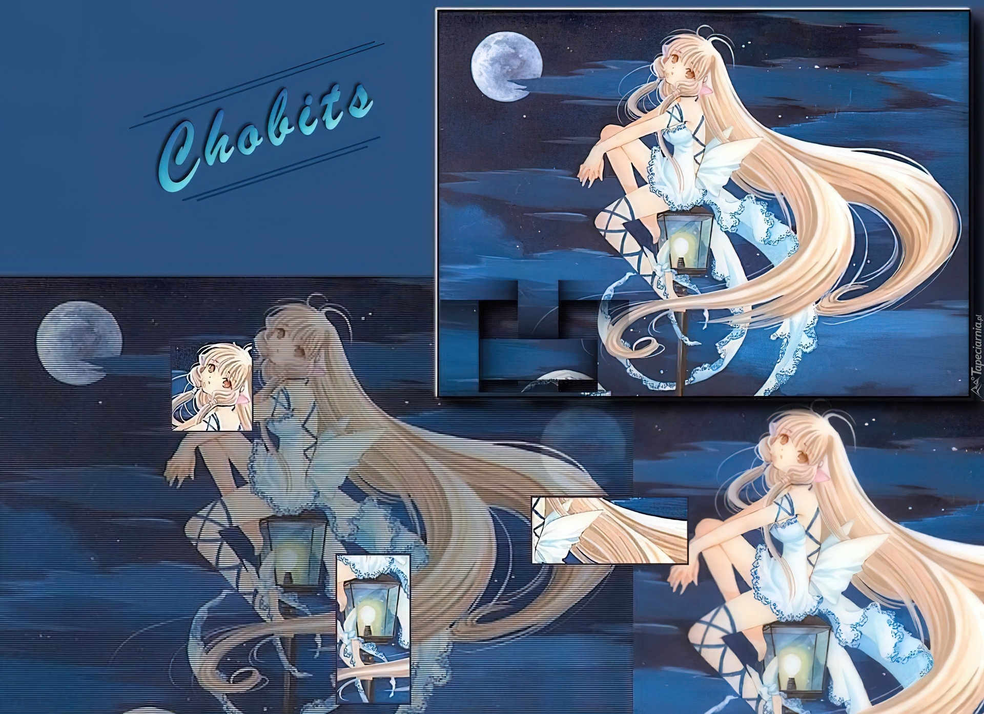 Edytor tapety: Chobits, księżyc, latarnia, siedzi, nogi