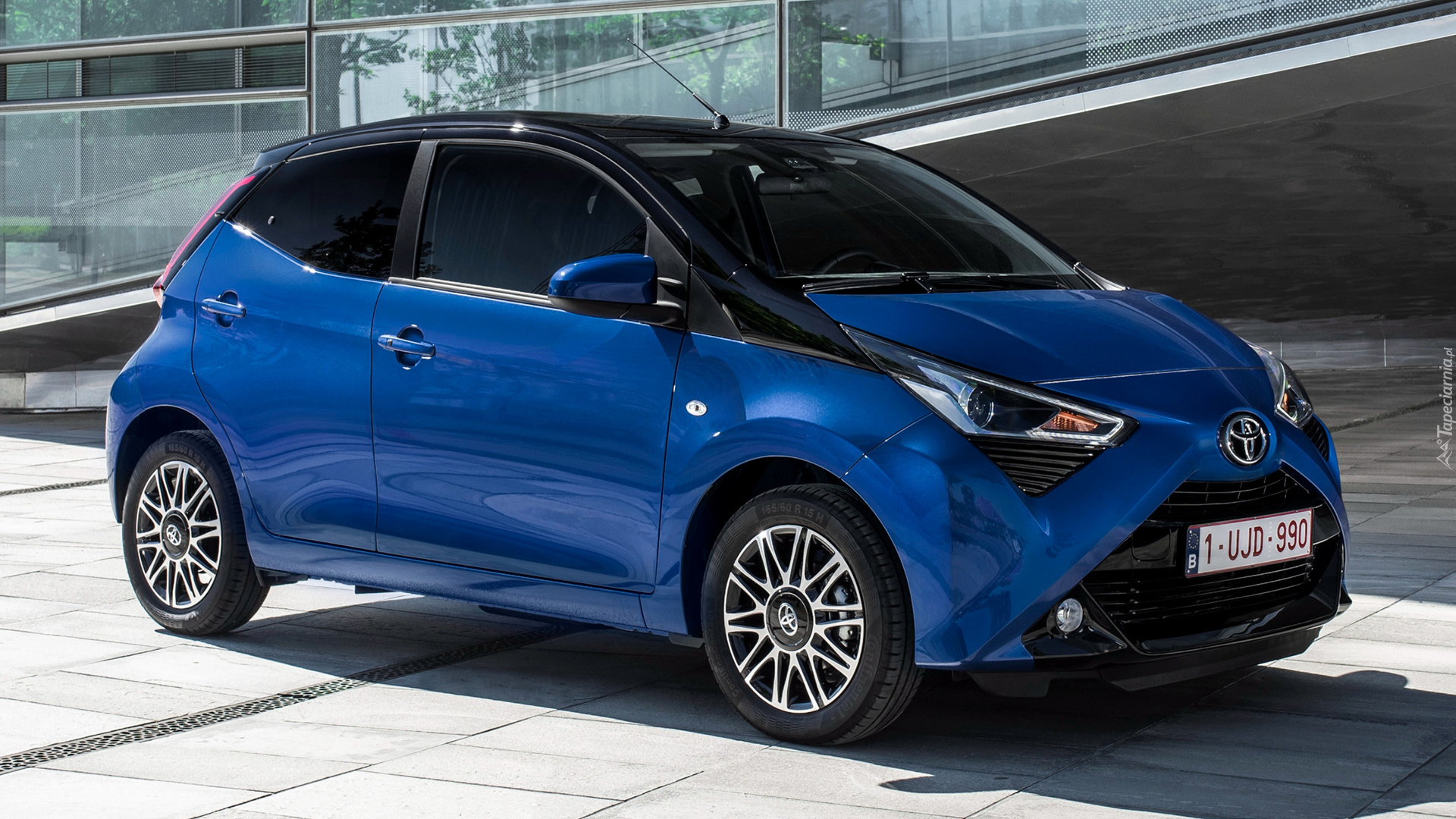 Edytor tapety: Niebieska Toyota Aygo z czarnym dachem