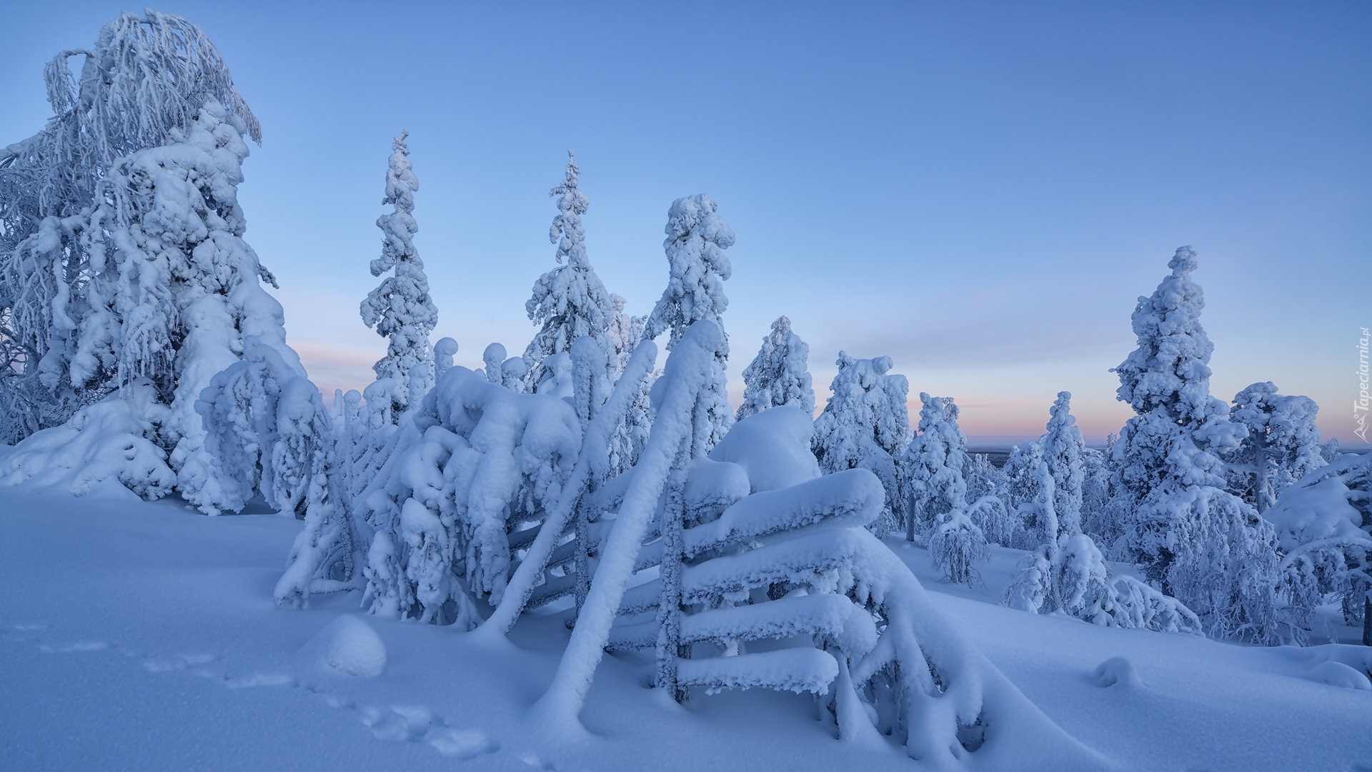 Edytor tapety: Ośnieżone drzewa przy płocie