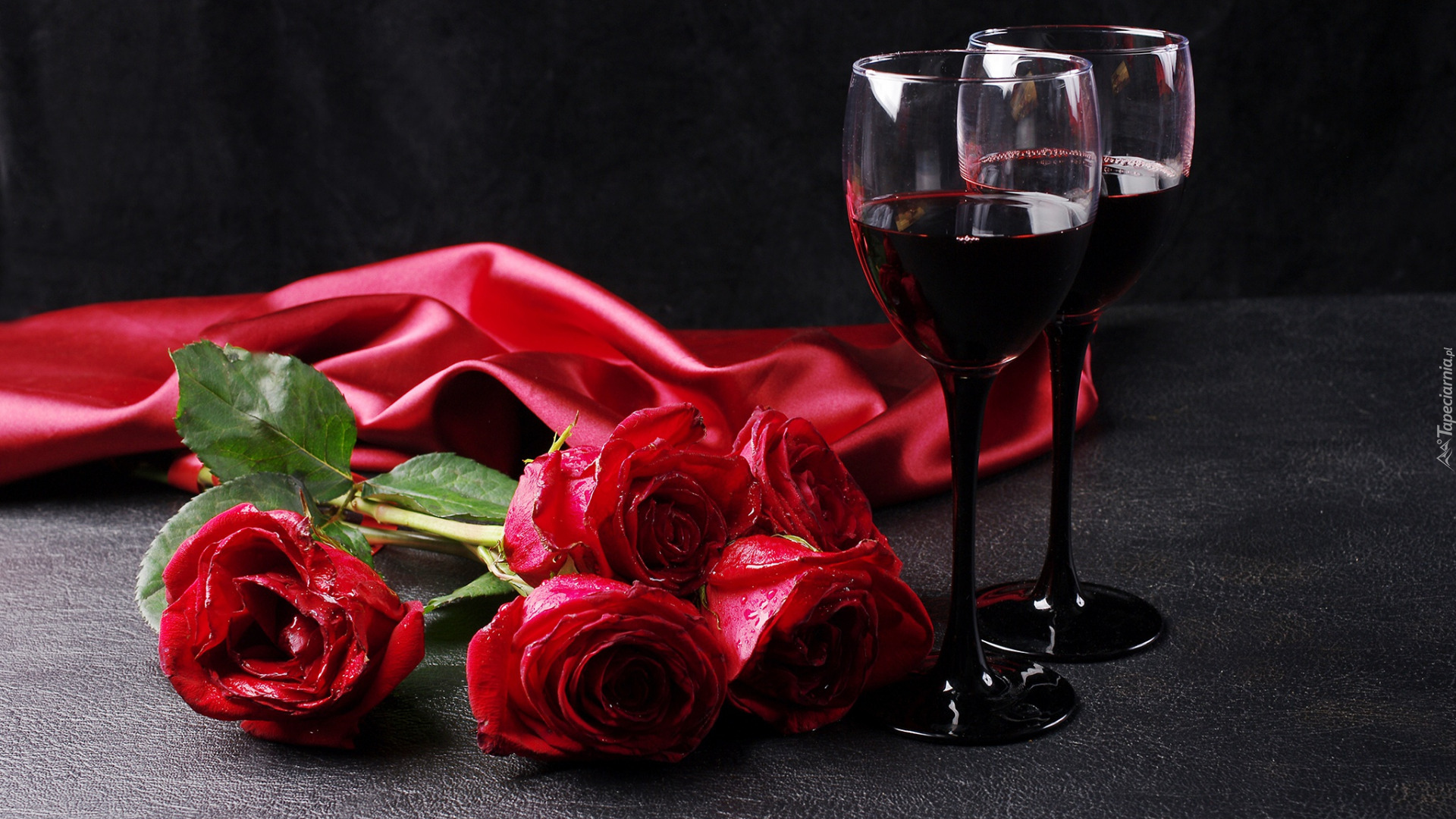 Edytor tapety: Czerwone róże obok kieliszków z winem