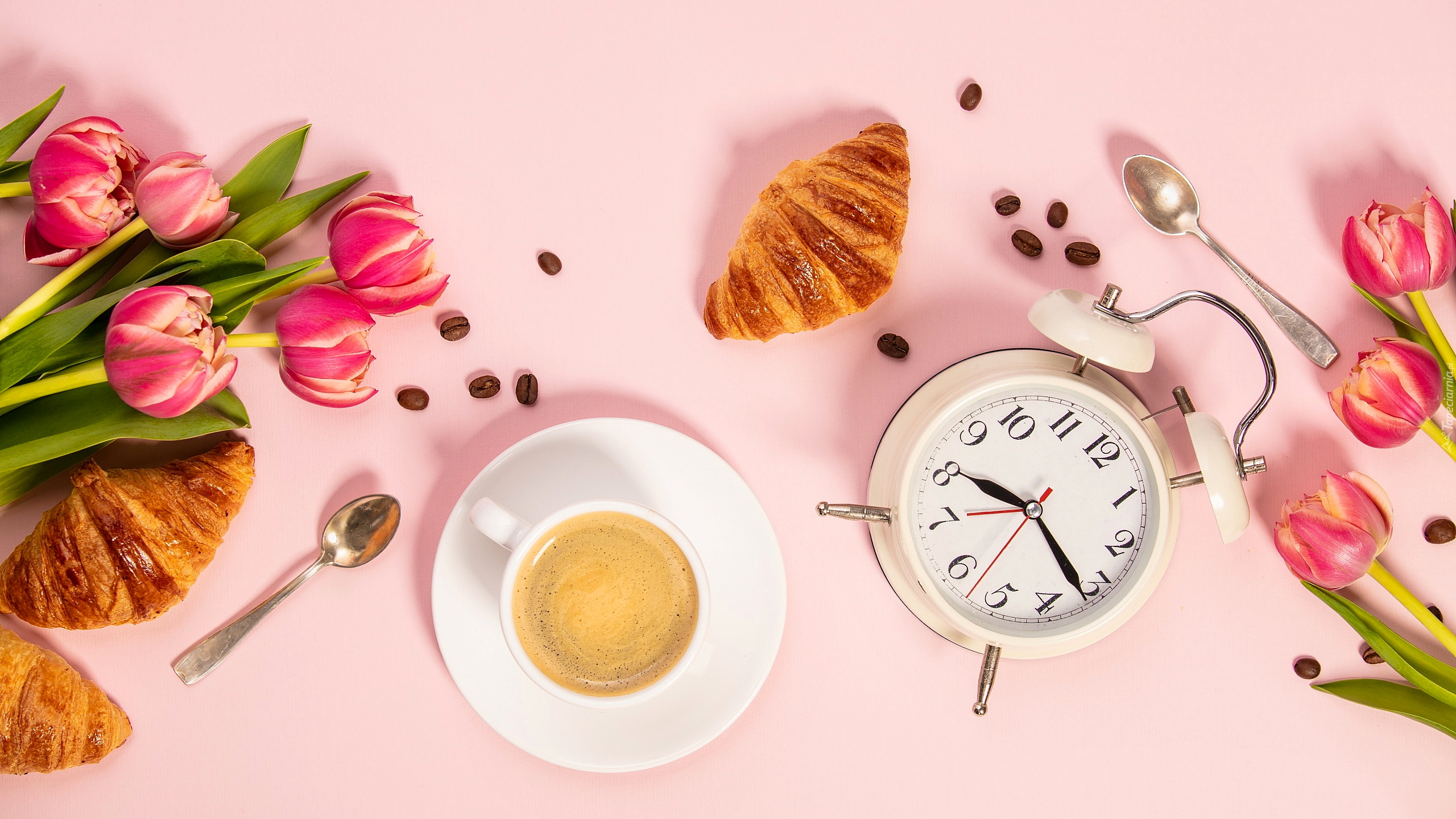 Edytor tapety: Filiżanka kawy i budzik obok tulipanów