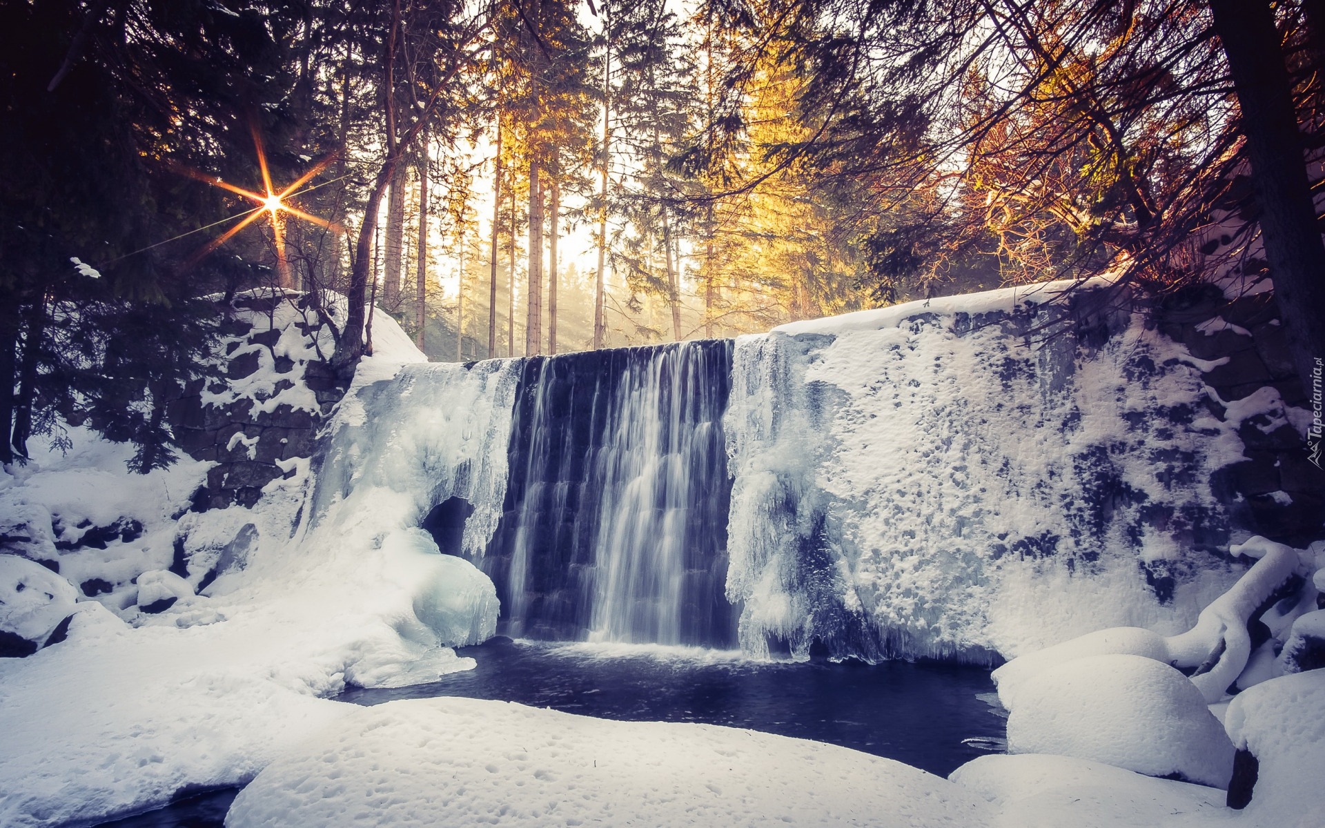 Edytor tapety: Oblodzony wodospad w lesie