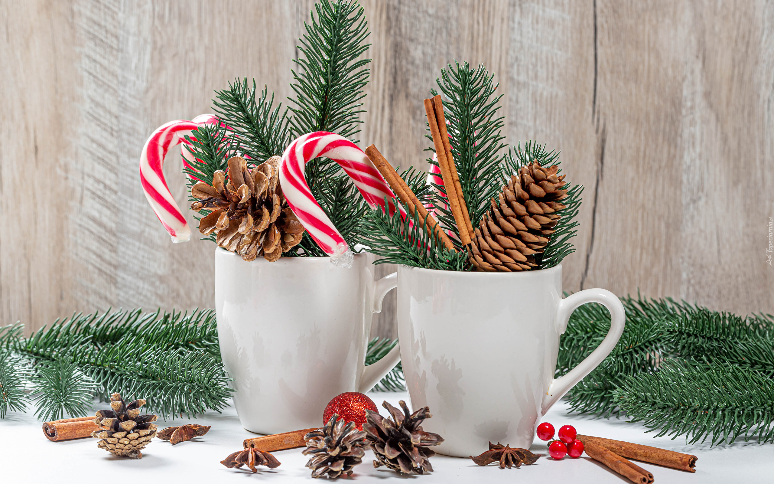 Edytor tapety: Gałązki z szyszkami i lizaki w kubkach