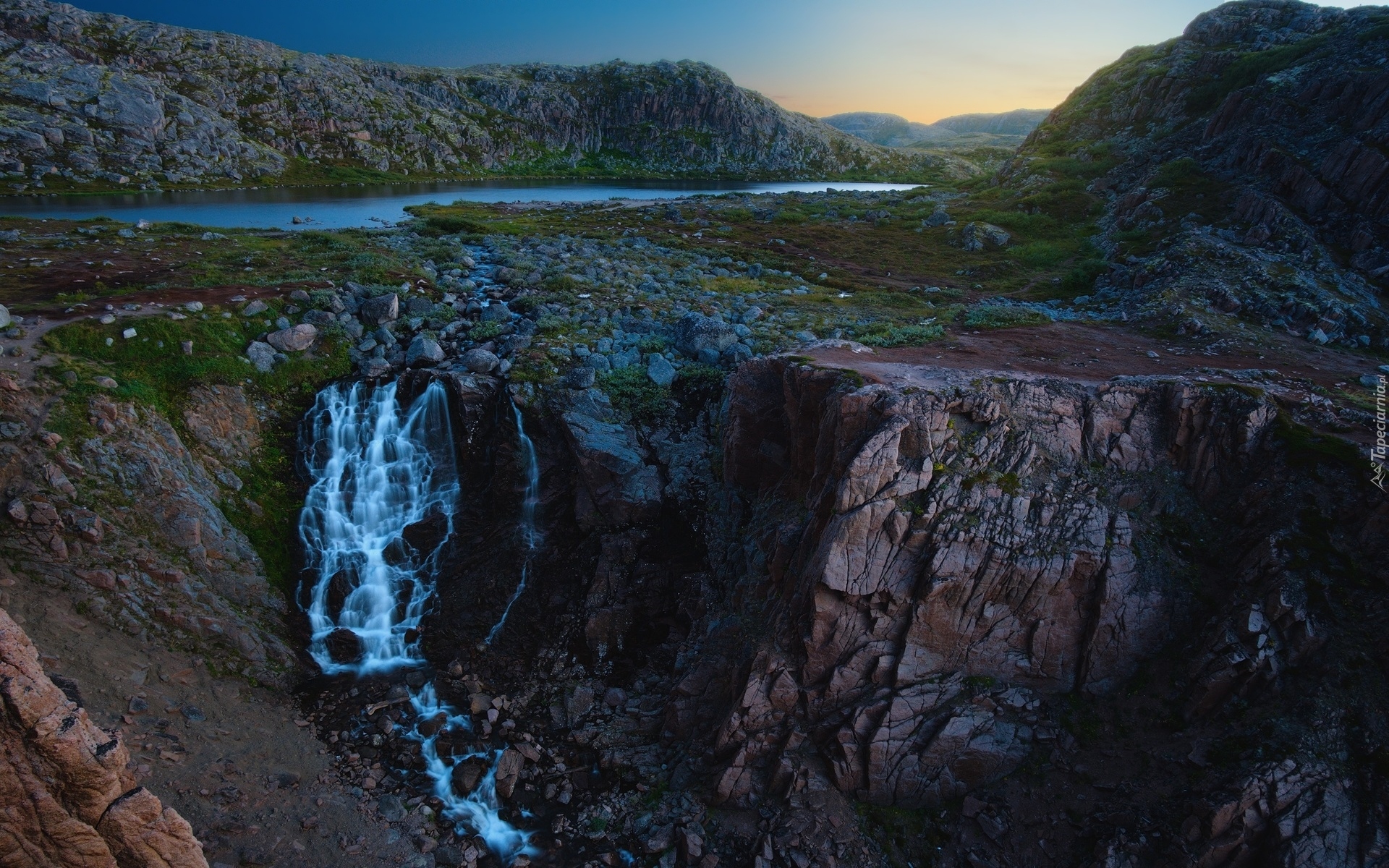 Edytor tapety: Strumyk płynący z jeziora po skale