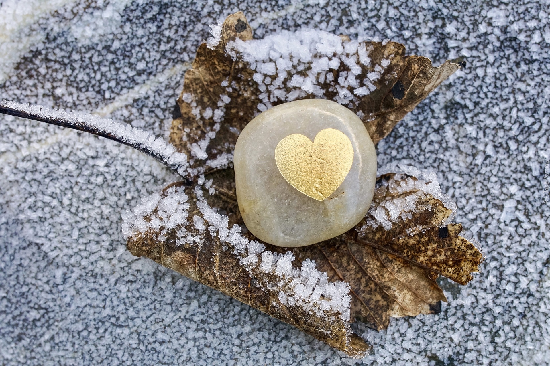Edytor tapety: Kamień ze złotym sercem na oszronionym liściu