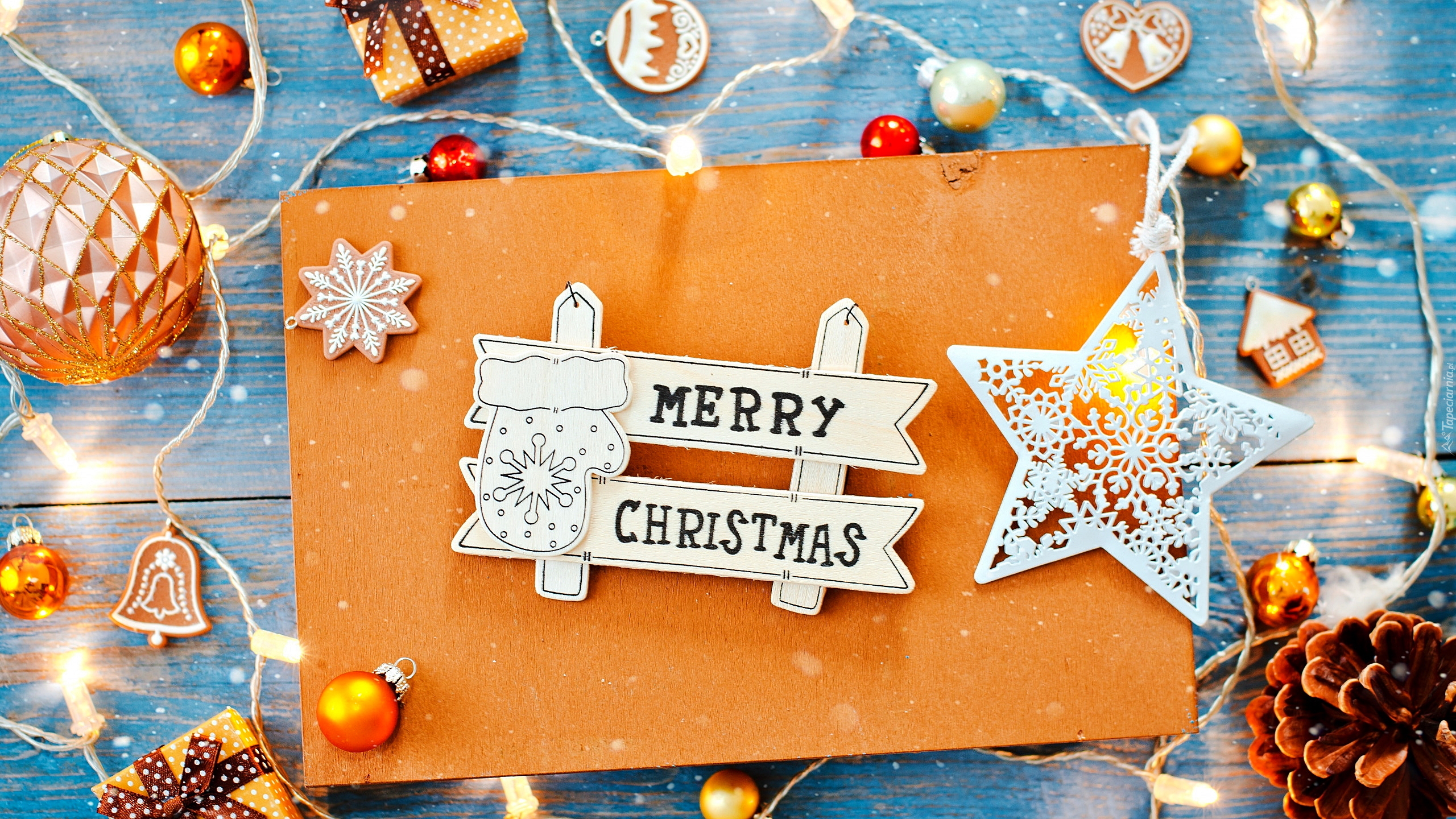 Edytor tapety: Napis Merry Christmas na kartce pośród świątecznych ozdób