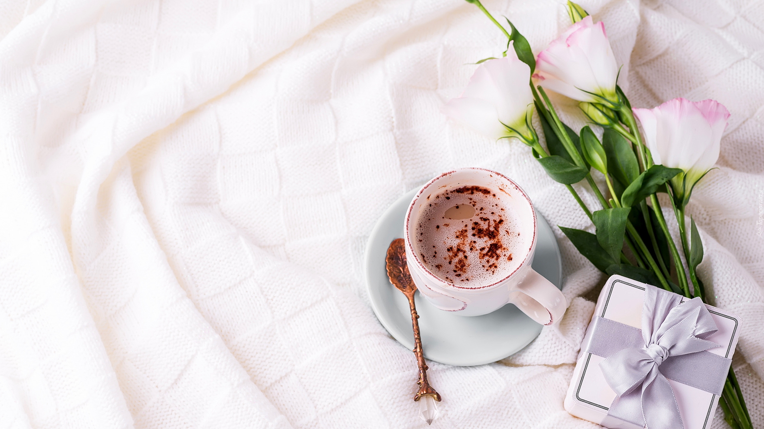 Edytor tapety: Filiżanka z kawą obok prezentów i kwiatów eustomy