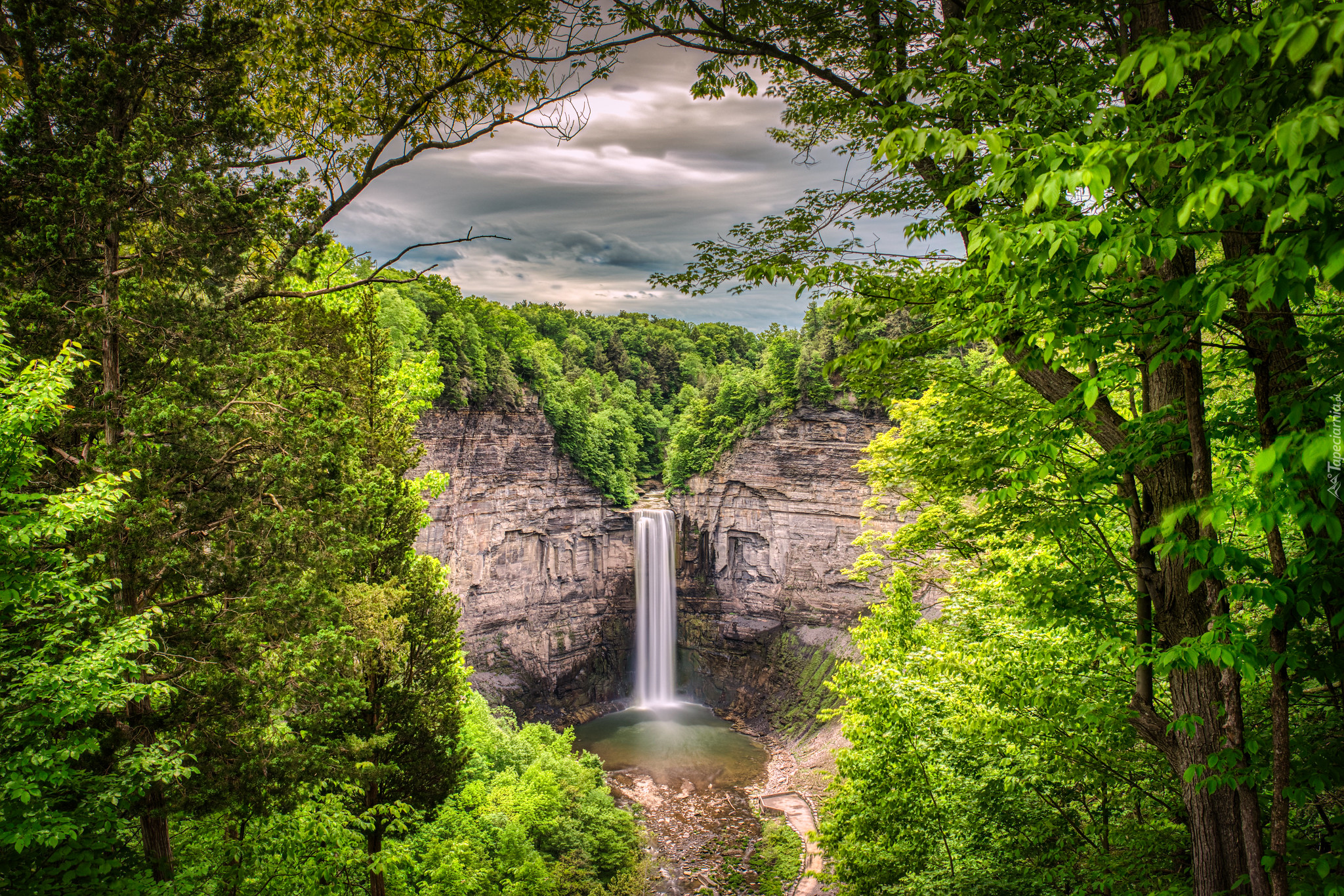 Edytor tapety: Wodospad na skale pośród zielonych drzew