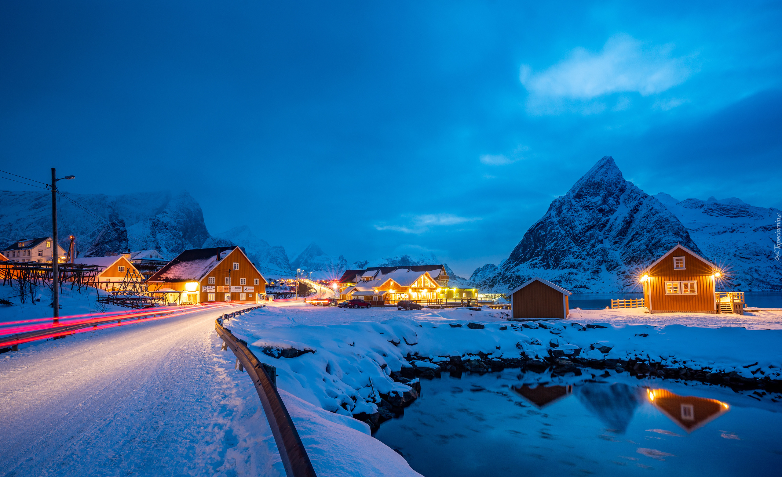 Edytor tapety: Wioska rybacka na wyspie Sakrisoy w zimową noc