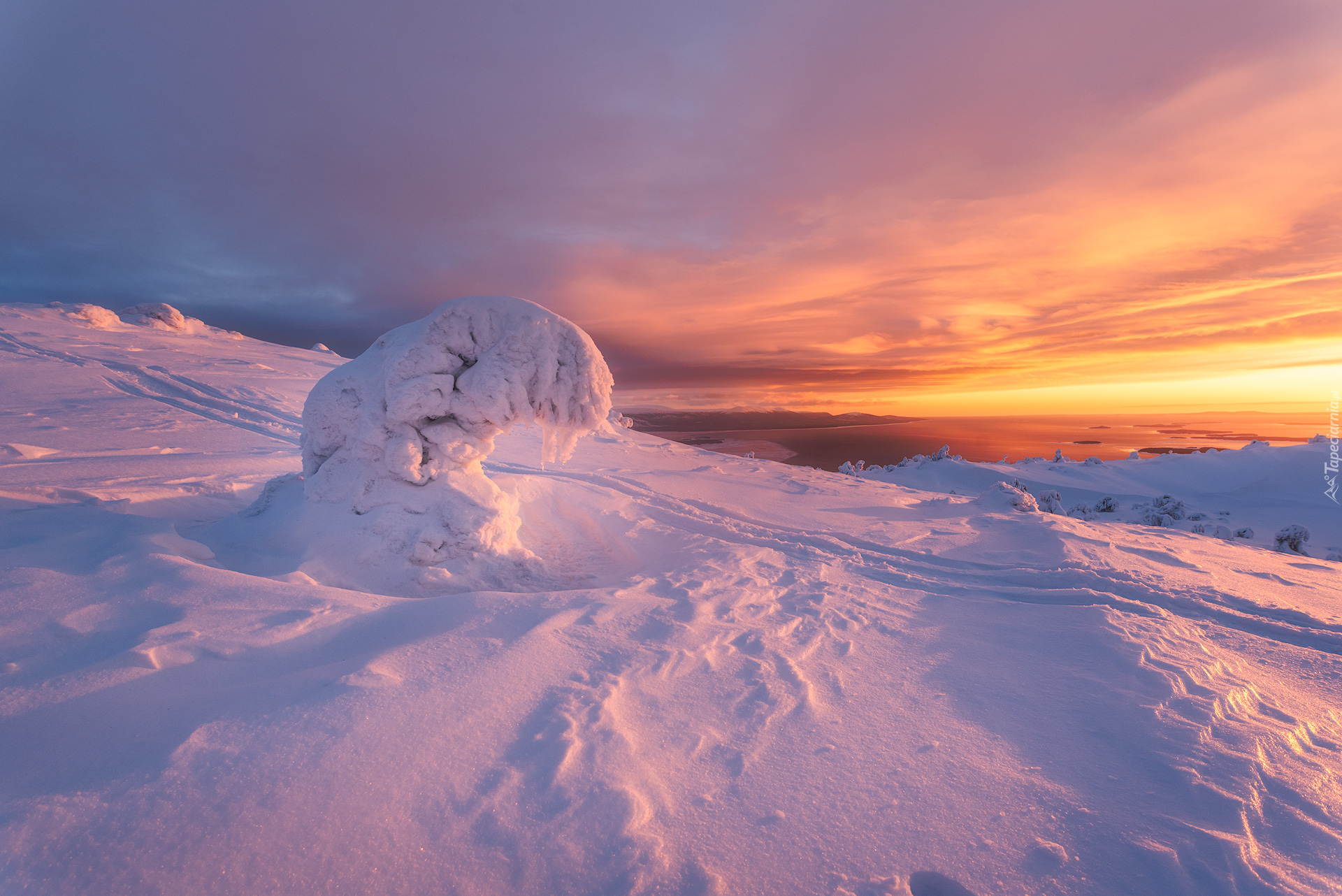 Edytor tapety: Drzewo w śniegu na tle zachodzącego słońca