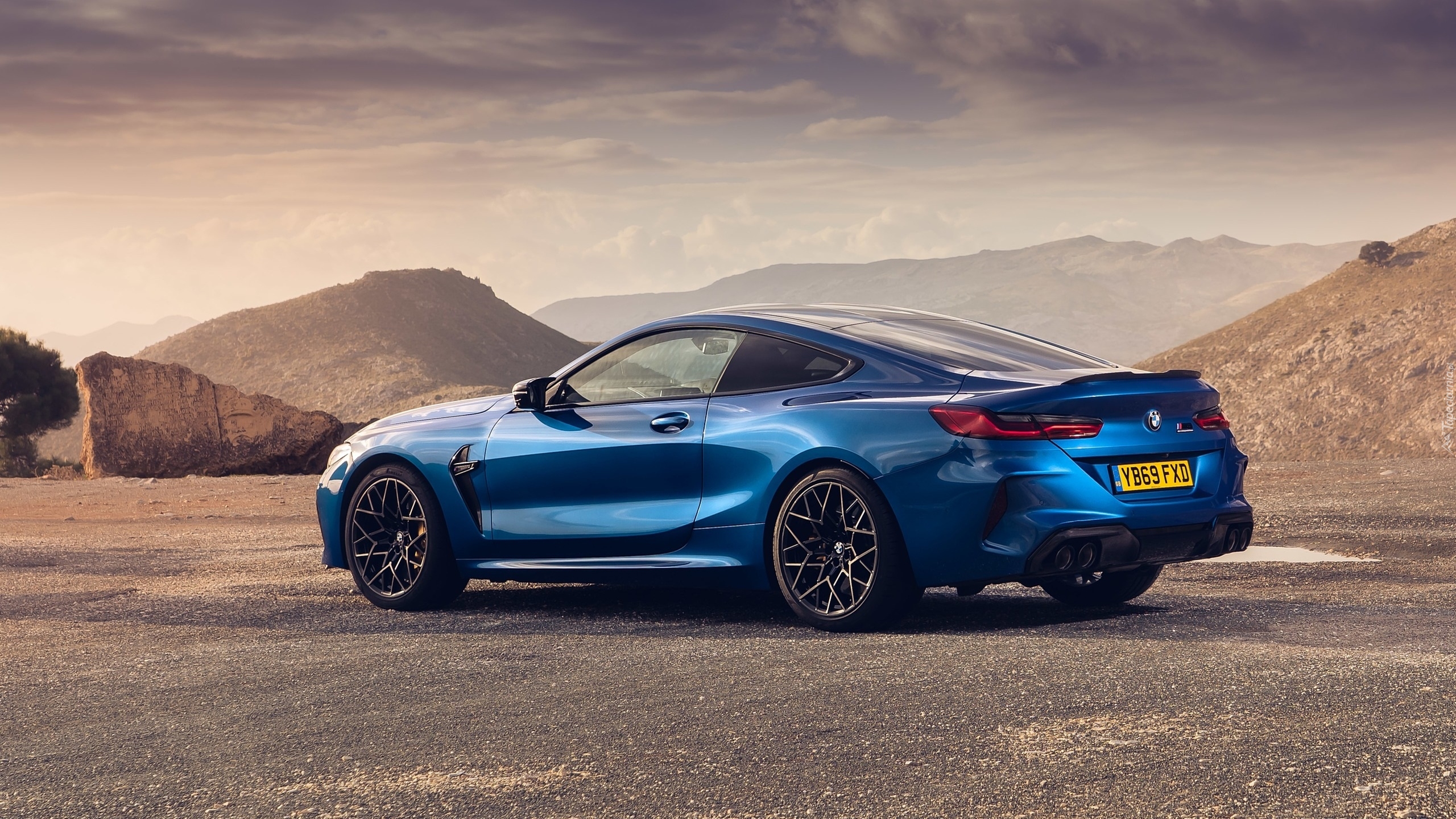 Edytor tapety: Niebieskie BMW M8 na tle gór