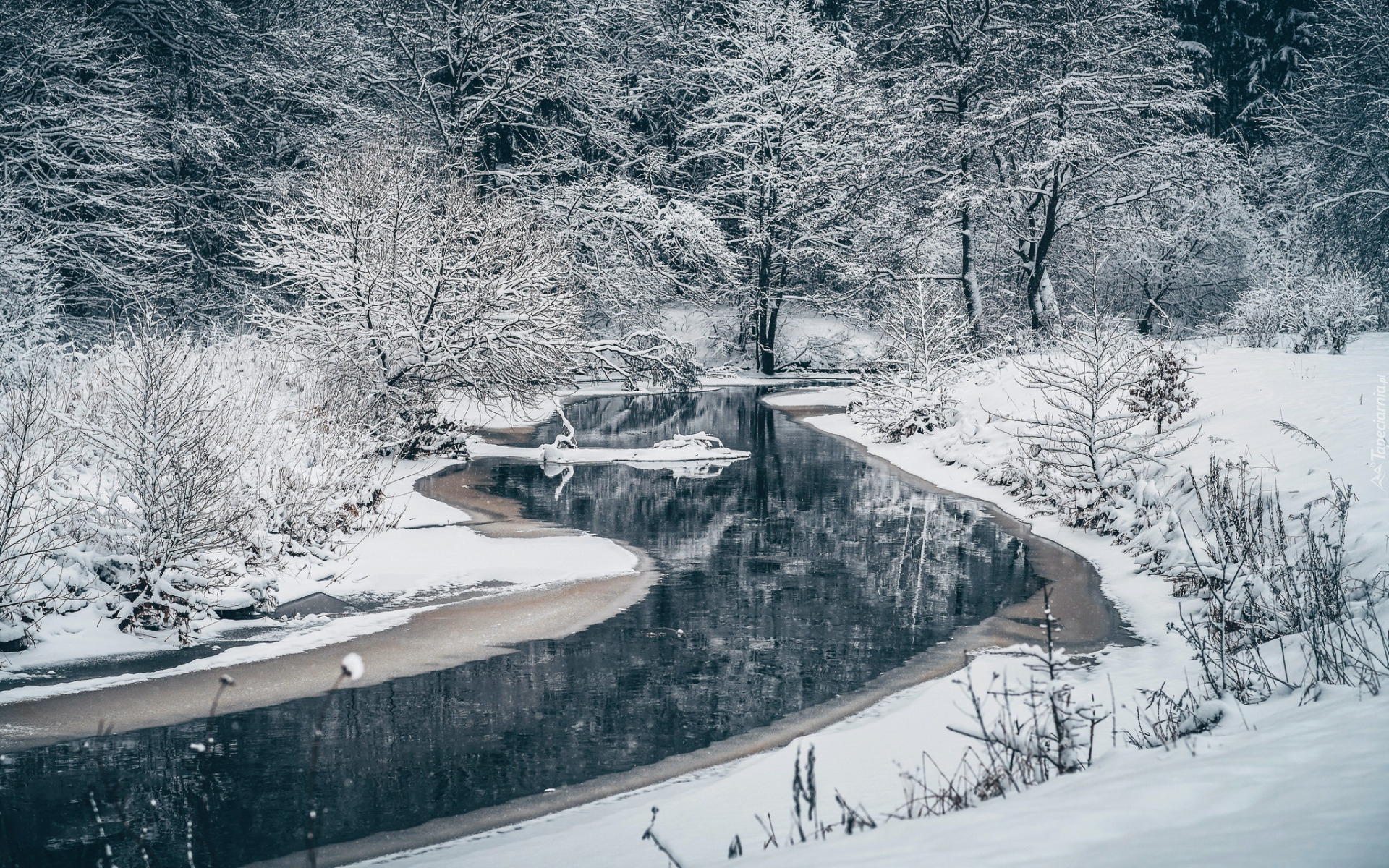 Edytor tapety: Ośnieżone drzewa nad rzeką w lesie