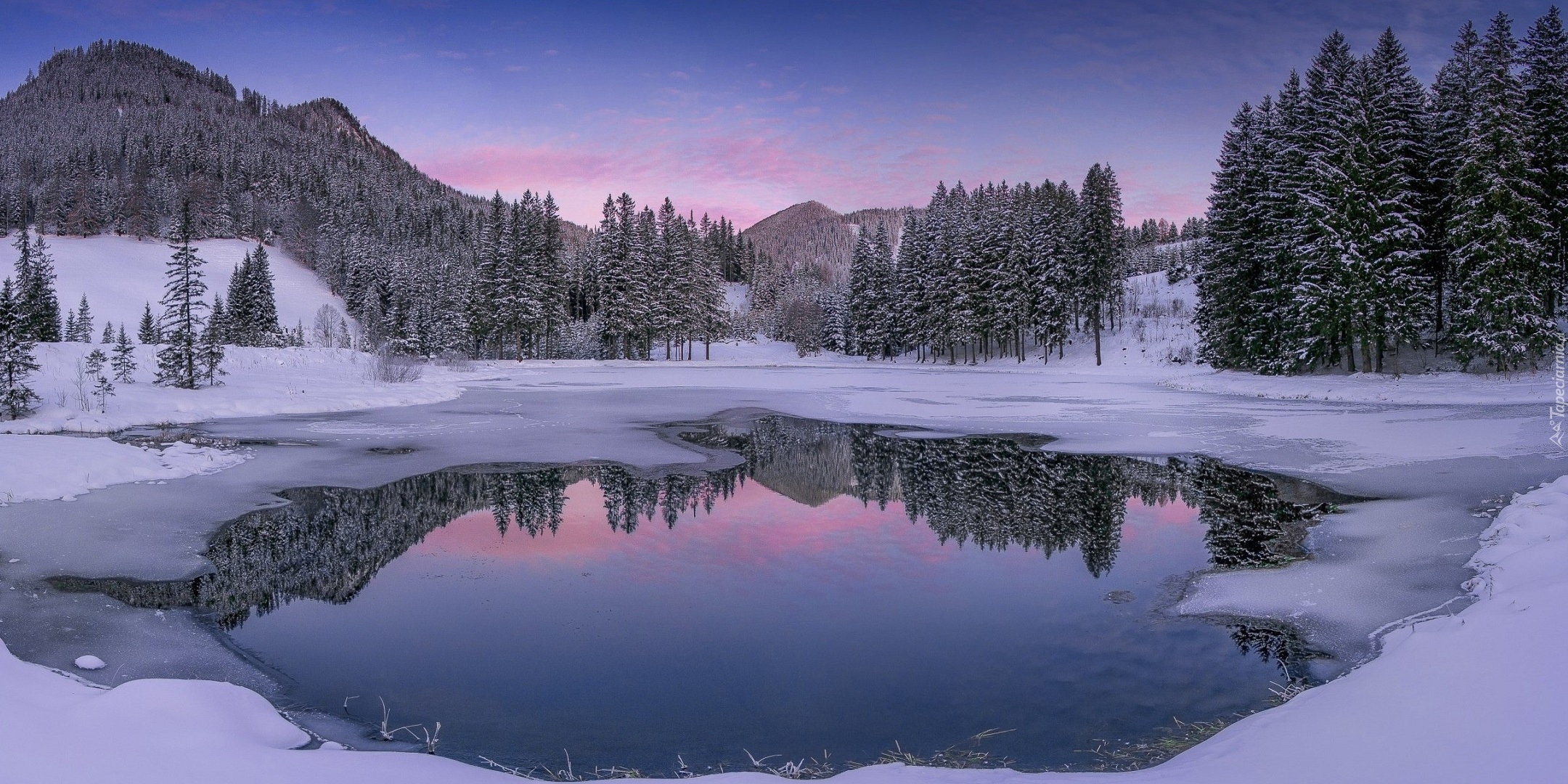 Edytor tapety: Ośnieżone drzewa nad jeziorkiem