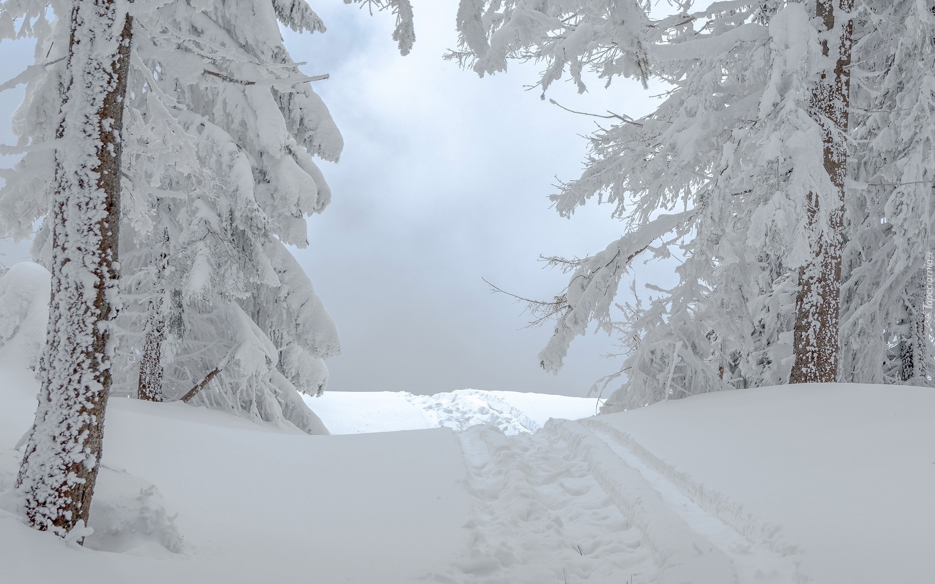 Edytor tapety: Ścieżka między drzewami w śniegu
