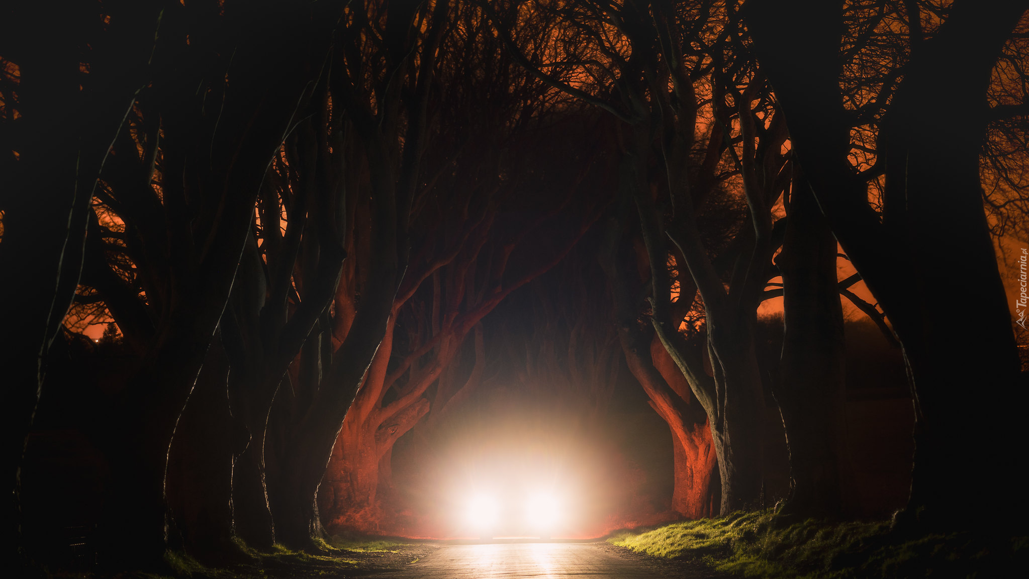 Edytor tapety: Światła samochodu w bukowej alei Dark Hedges