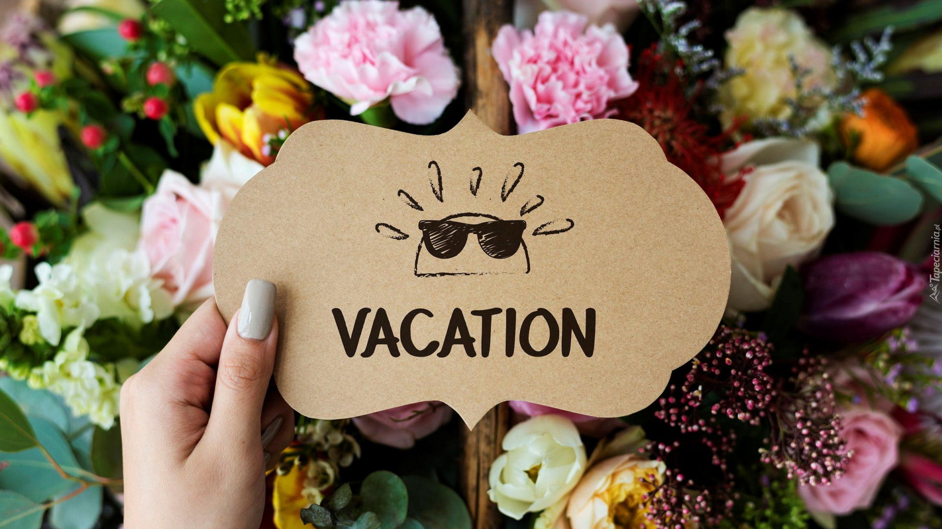 Edytor tapety: Dłoń trzymająca tabliczkę z napisem wakacje