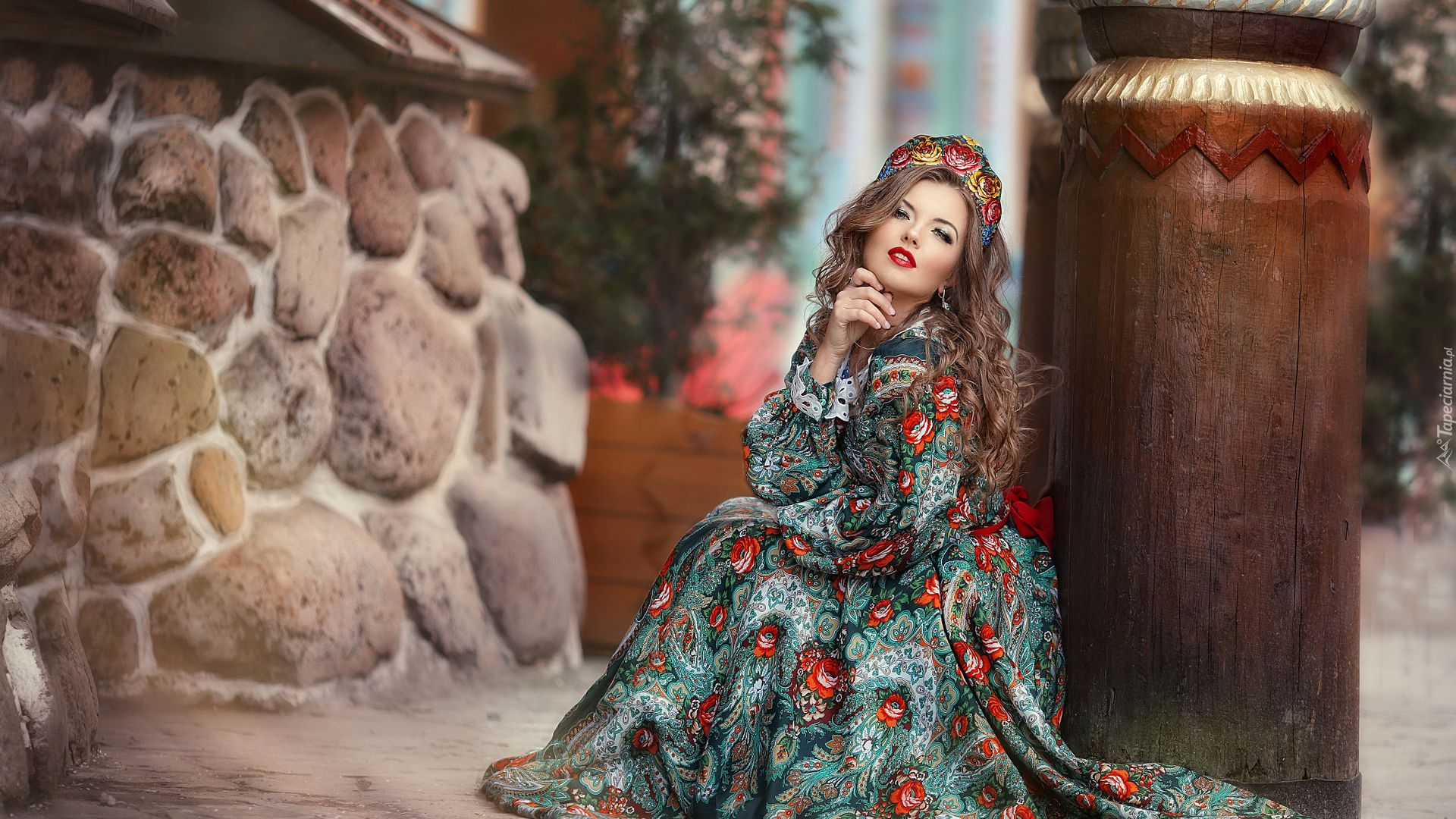 Edytor tapety: Kobieta w kolorowej sukience i nakryciu głowy