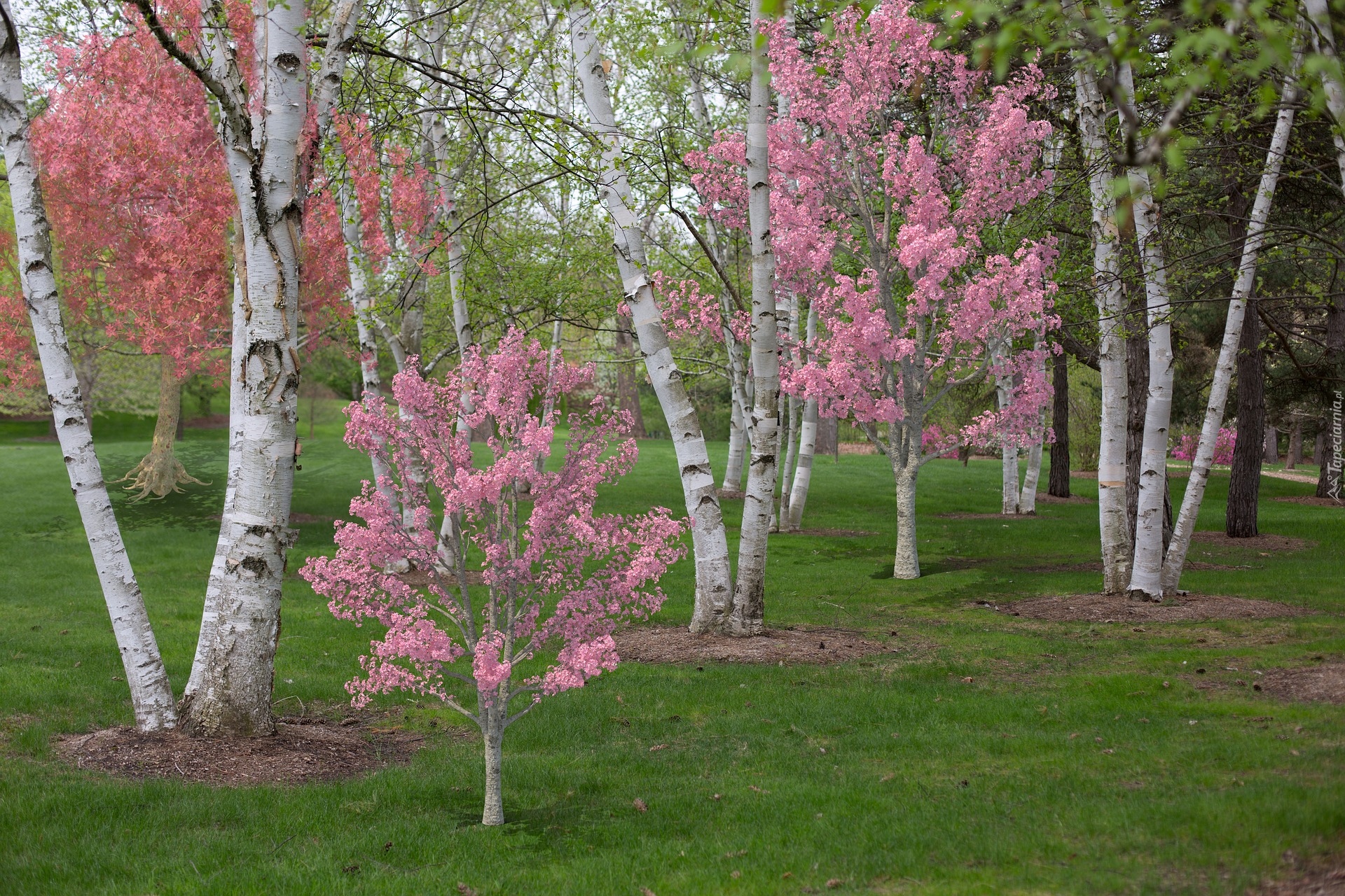 Edytor tapety: Kwitnące na różowo drzewa w wiosennym parku
