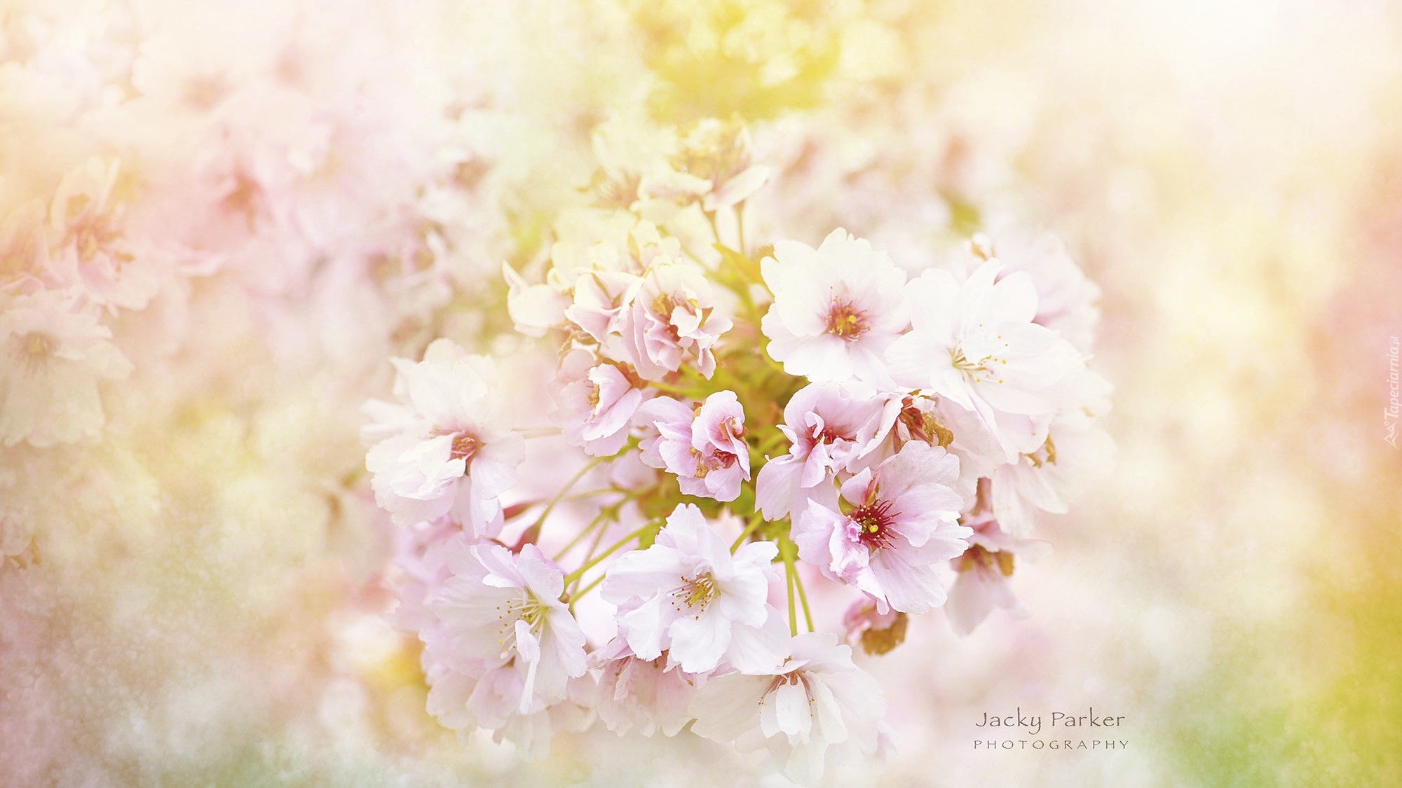 Edytor tapety: Gałązka różowych kwiatów na rozmytym tle