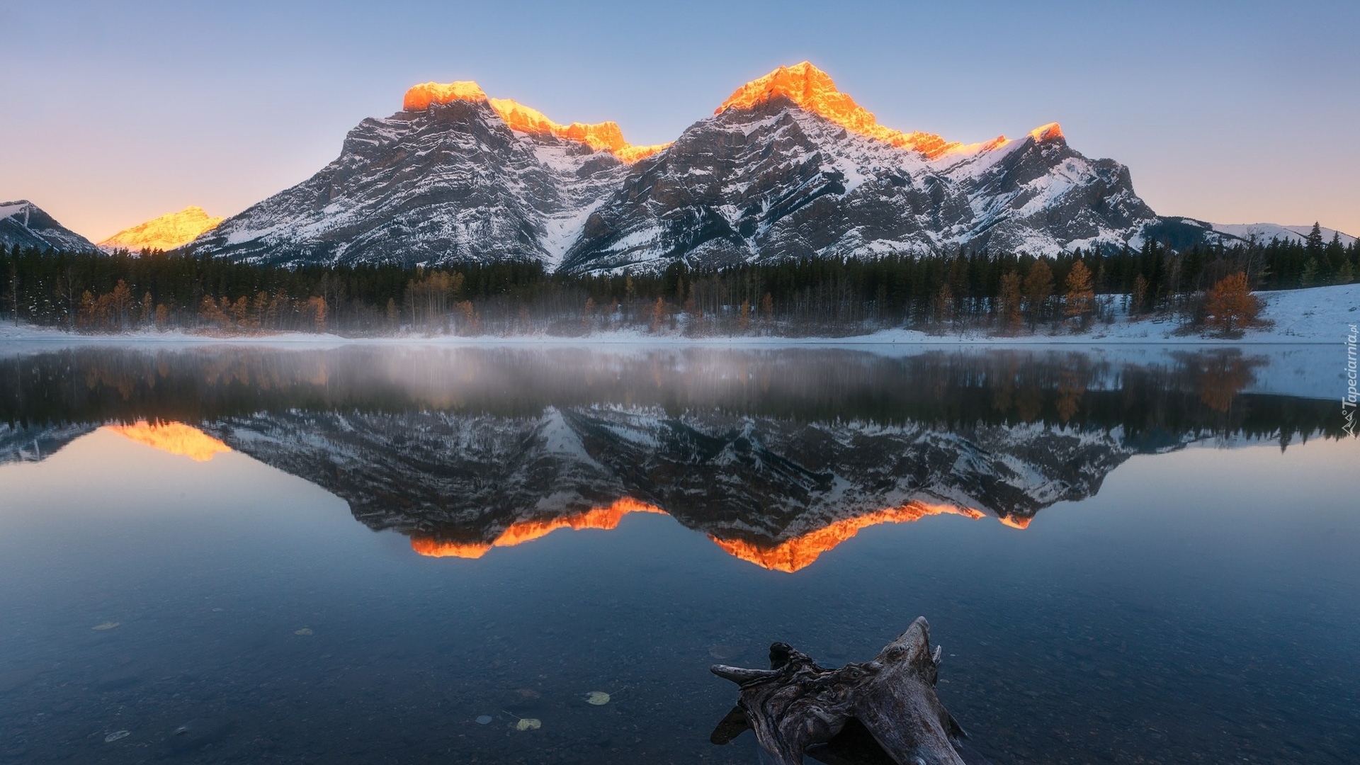 Edytor tapety: Jezioro z widokiem na rozświetlone słońcem szczyty gór