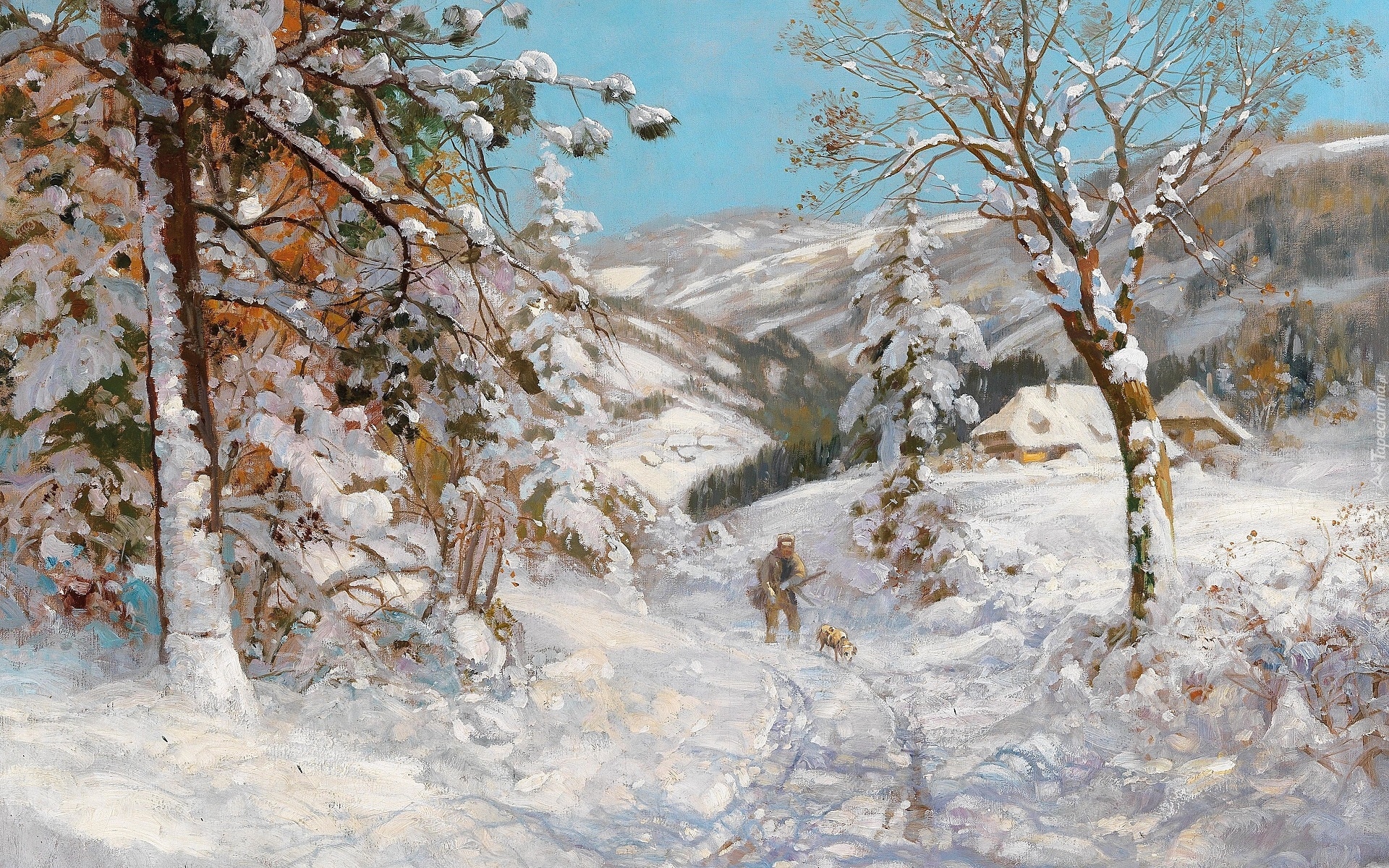 Edytor tapety: Myśliwy z psem na ośnieżonej drodze