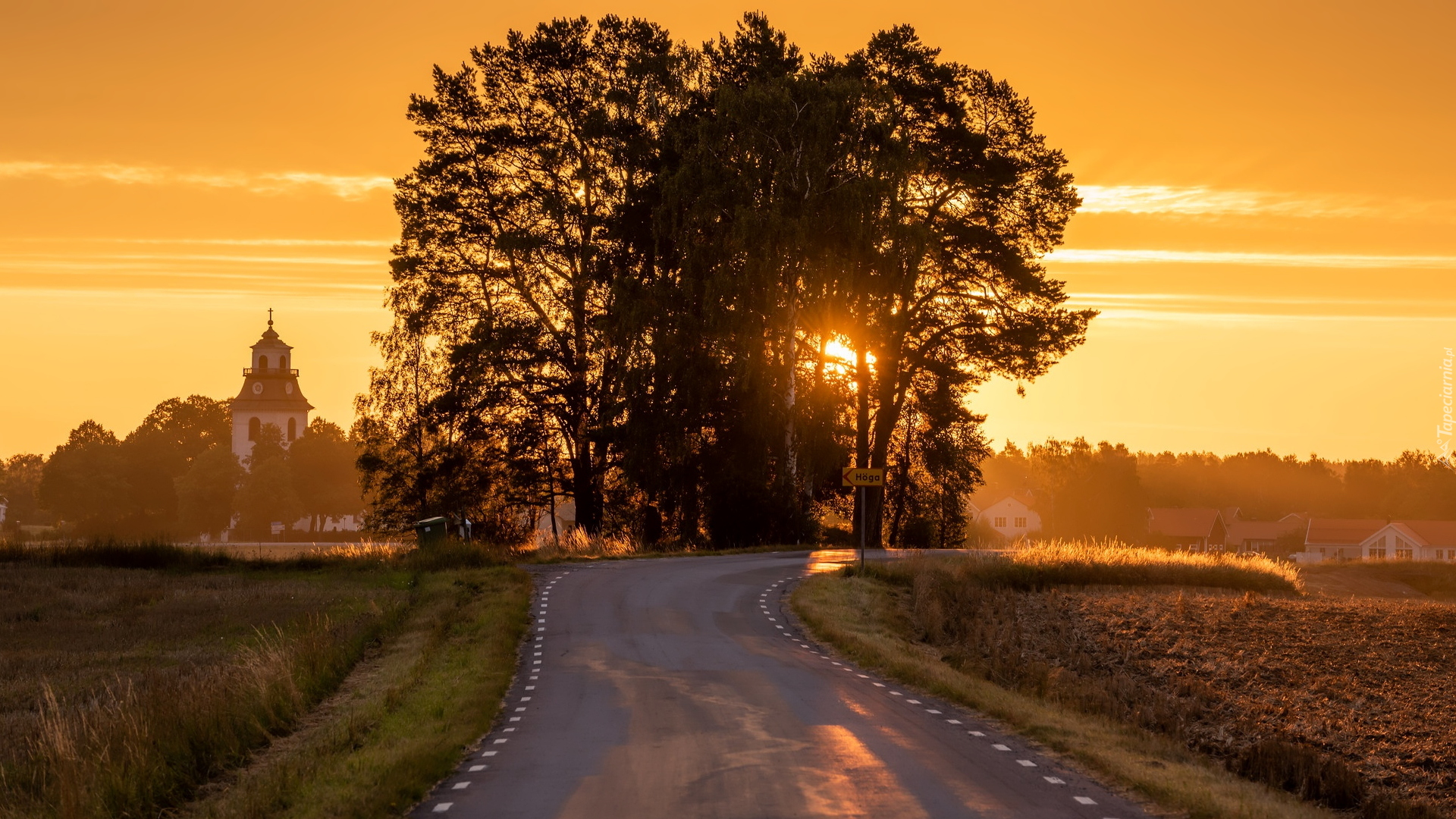 Edytor tapety: Wschodzące słońce w gałęziach drzew przy drodze