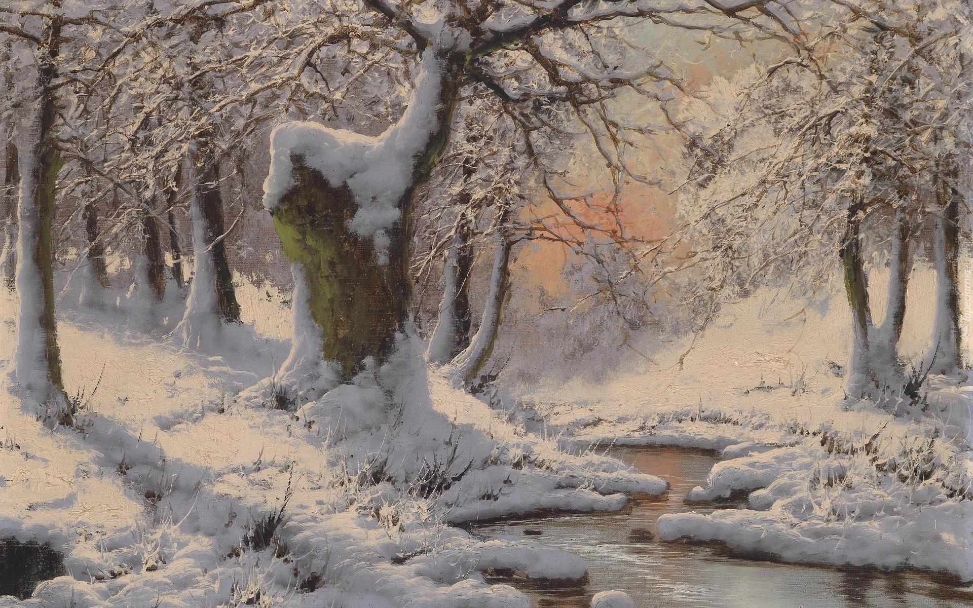 Edytor tapety: Rzeka w zimowym lesie na obrazie Laszlo Neogrady
