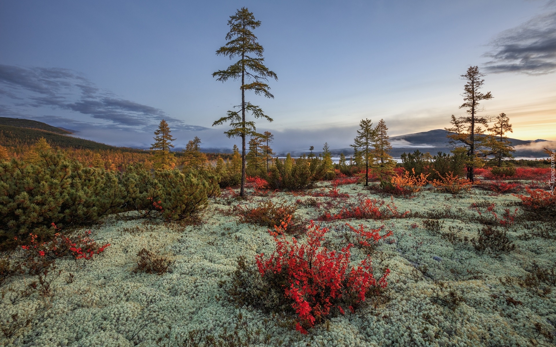 Edytor tapety: Kolorowe krzewy i drzewa na tle gór