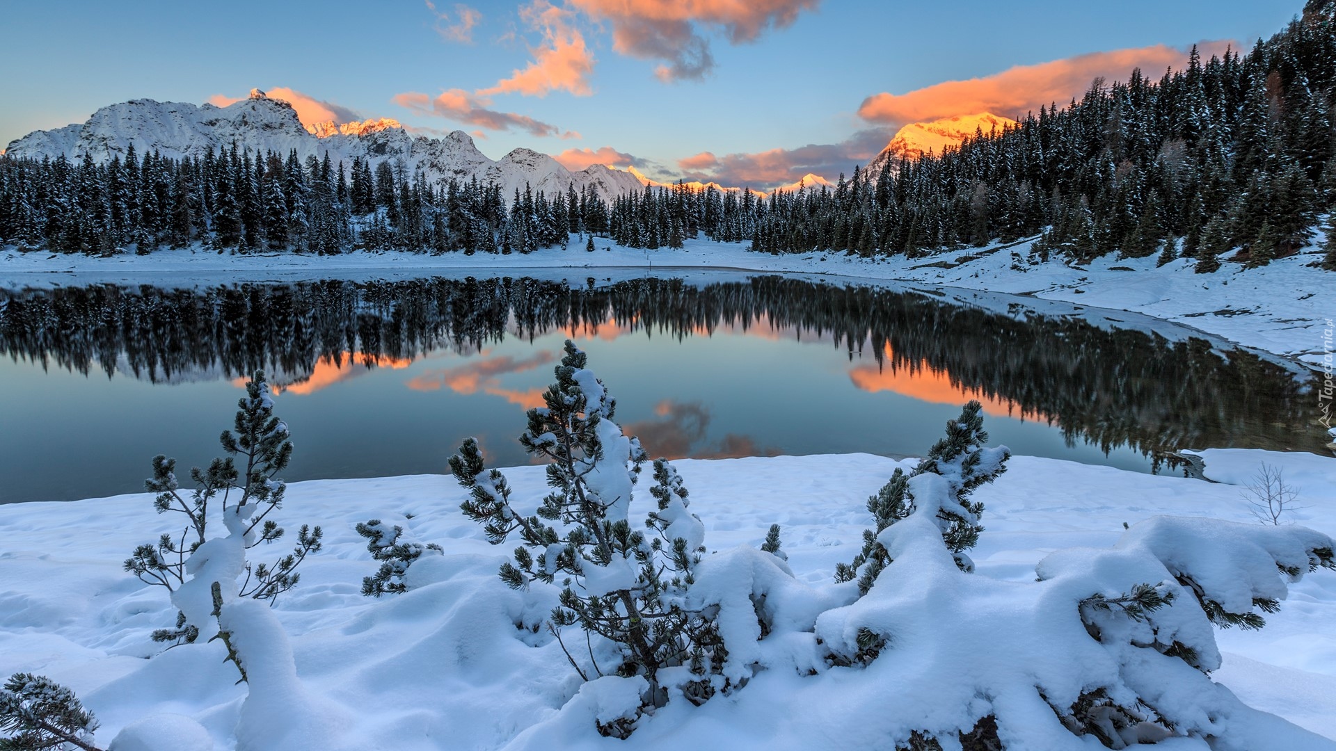 Edytor tapety: Ośnieżony brzeg jeziora w górach