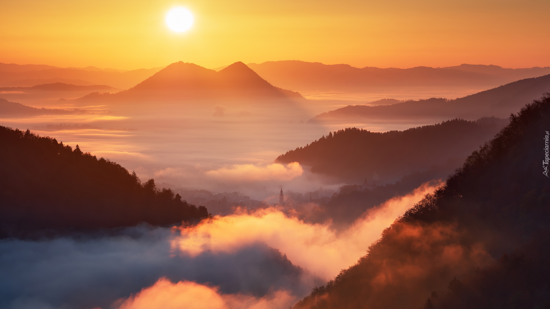Edytor tapety: Poranek nad zamglonymi górami i lasami w Słowenii