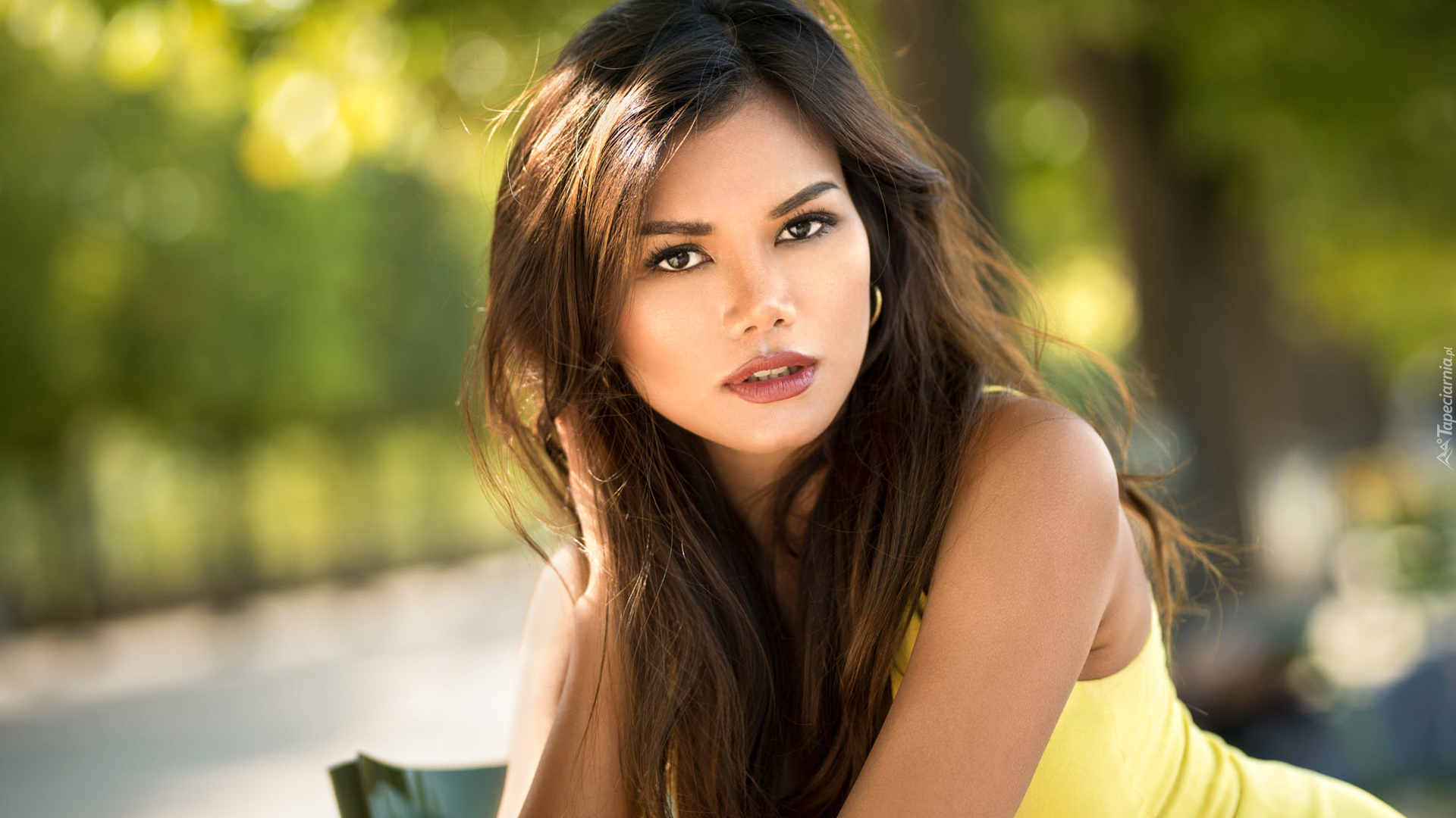 Edytor tapety: Długowłosa szatynka w żółtej bluzeczce