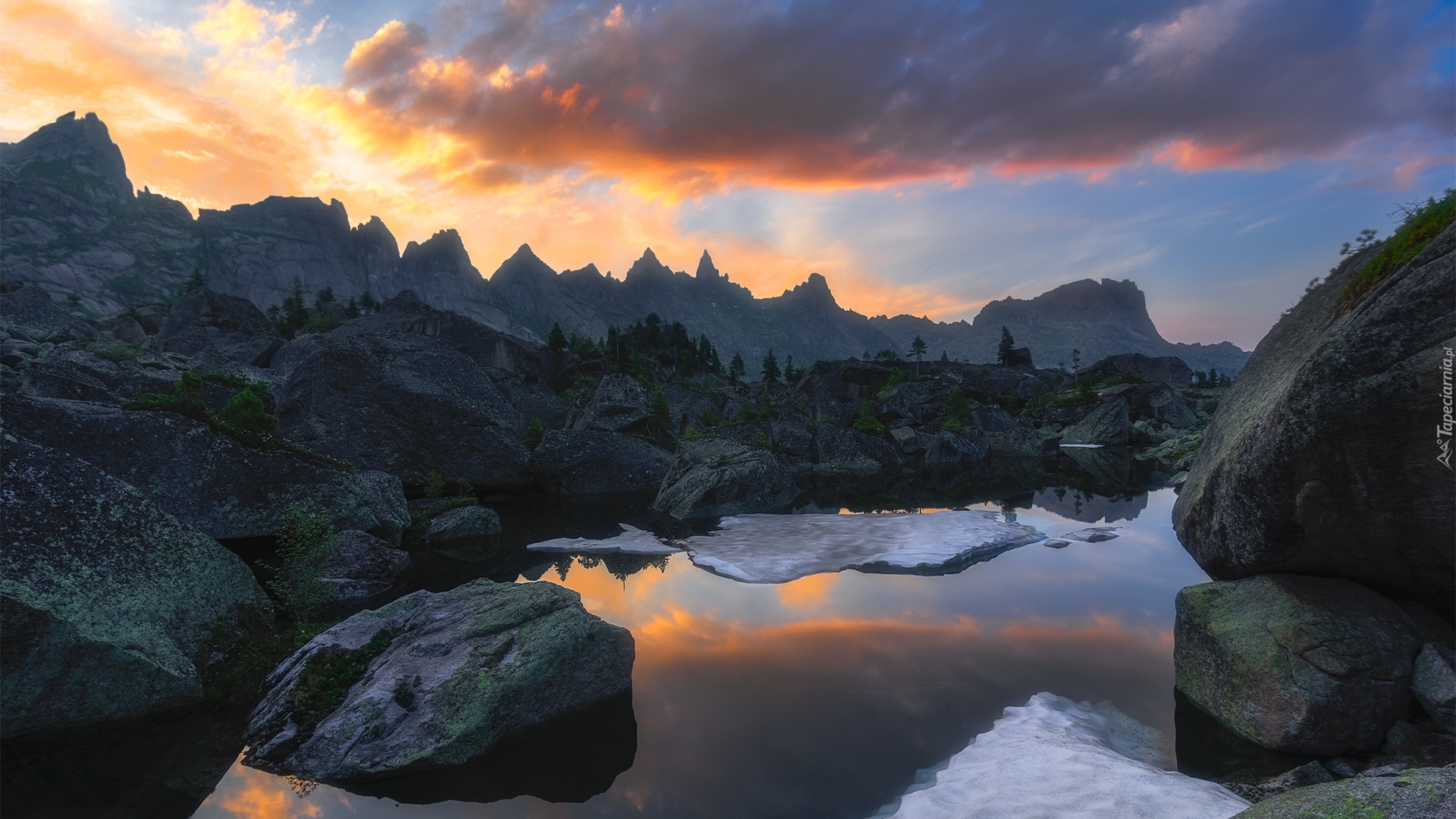 Edytor tapety: Ciemne skały w zachodzącym słońcu