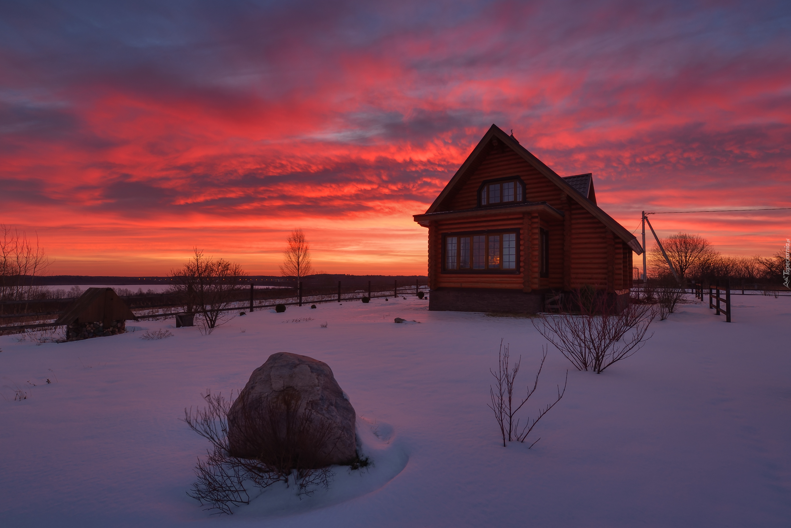 Edytor tapety: Dom we wsi Vashutino o zachodzie słońca
