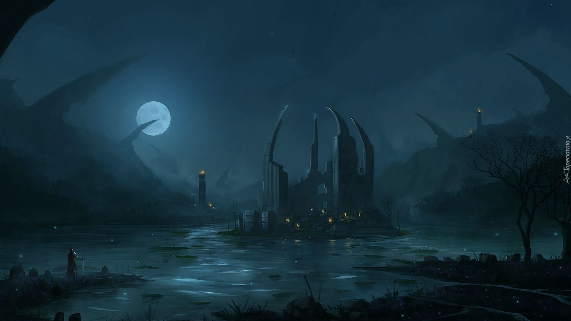 Edytor tapety: Budowla na jeziorze oświetlona blaskiem księżyca