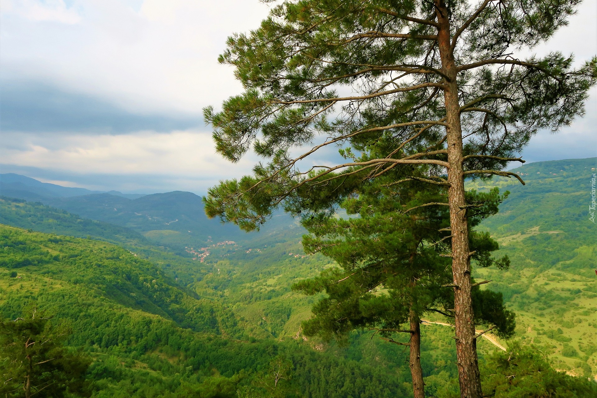 Edytor tapety: Sosny na wzgórzu z widokiem na dolinę