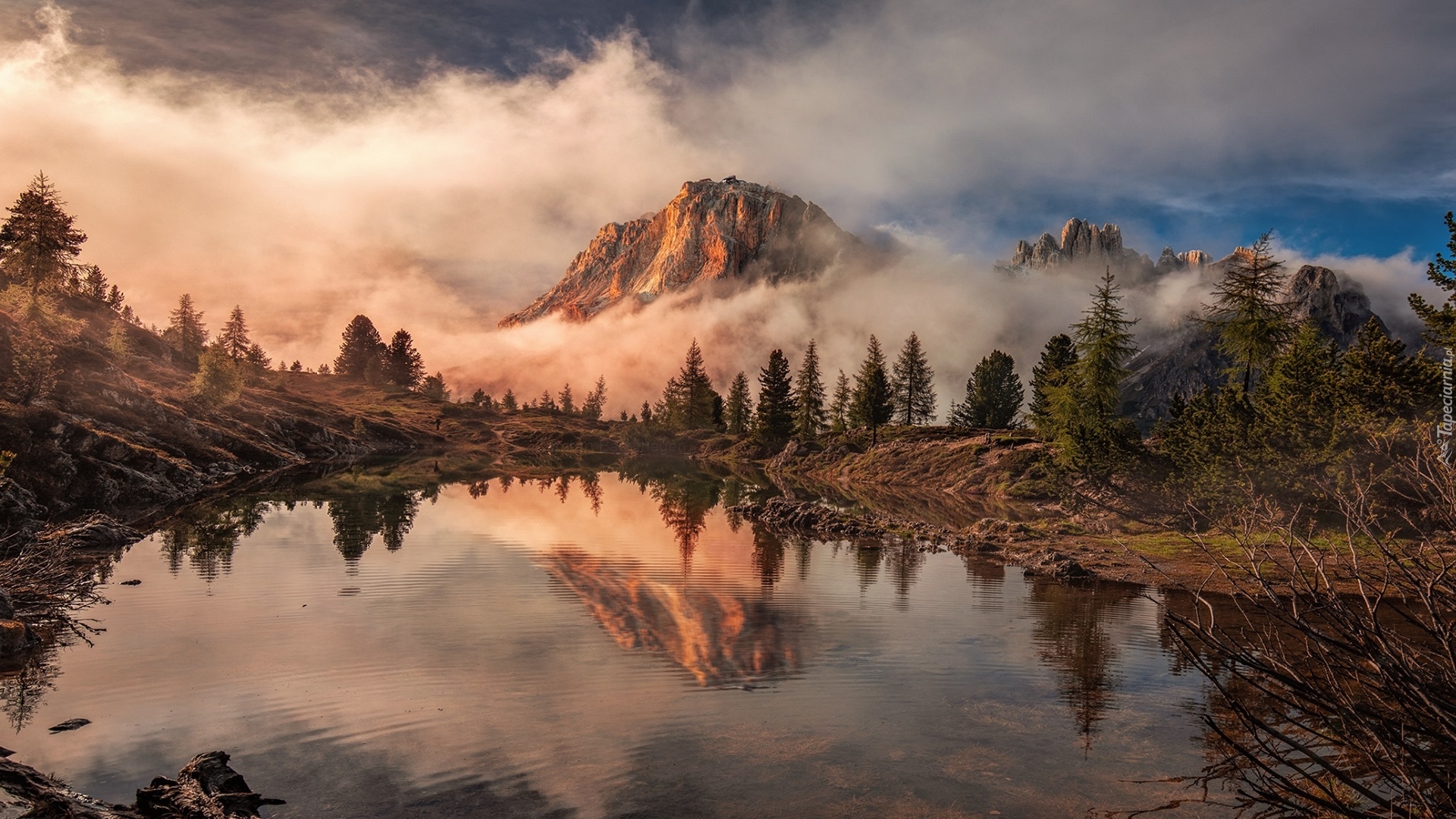 Edytor tapety: Jezioro Lago Limides na tle zamglonych Dolomitów