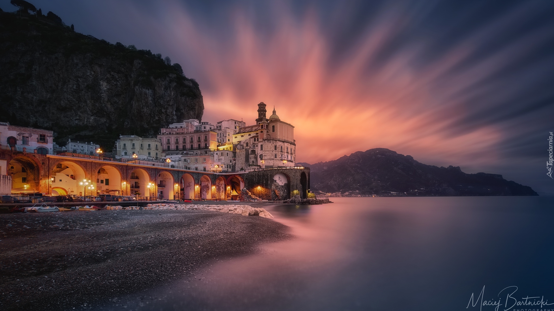 Edytor tapety: Oświetlone domy nad morzem we włoskiej miejscowości Amalfi