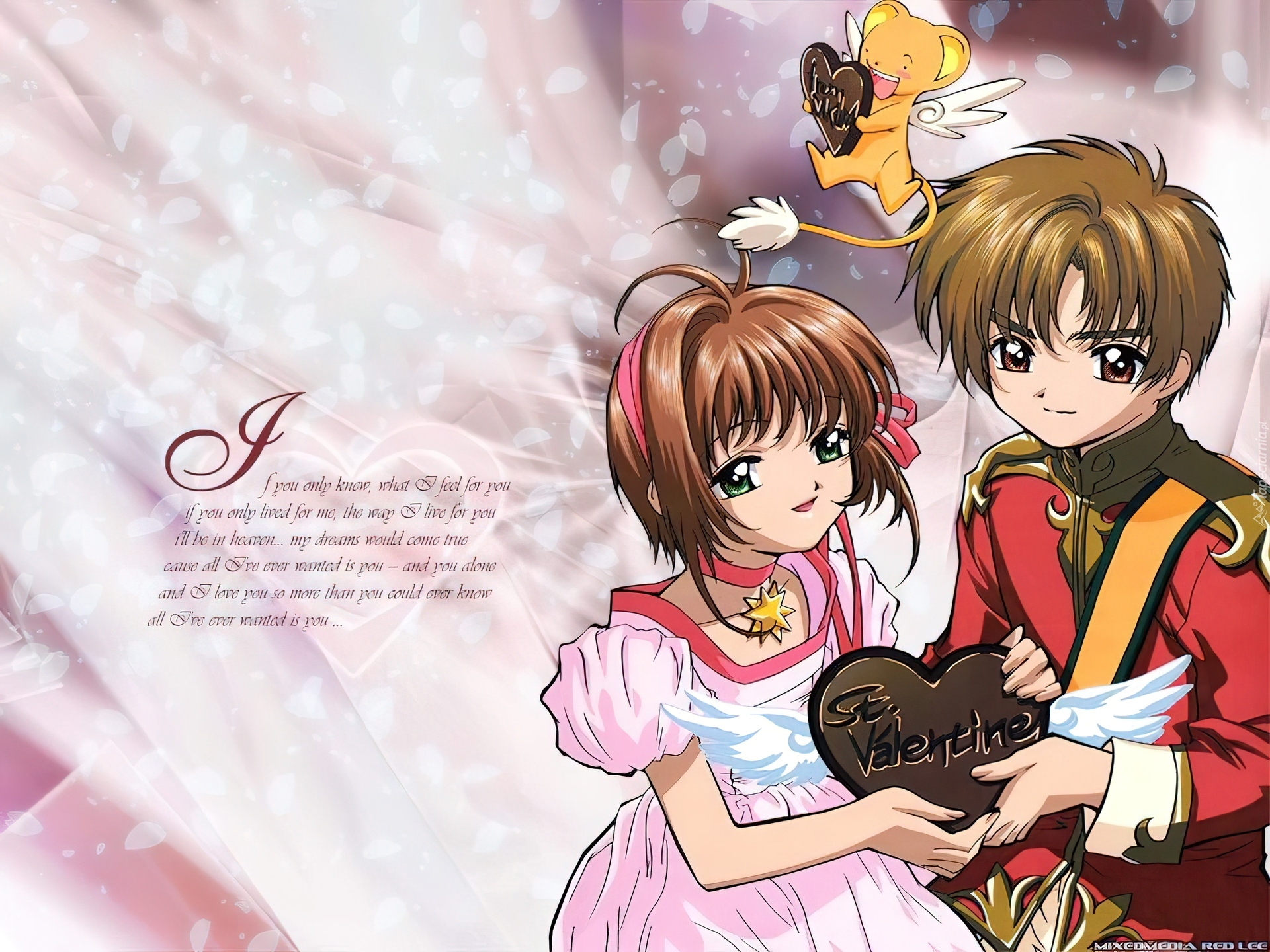 Edytor tapety: Cardcaptor Sakura, para, ludzie, napisy, serce, pluszak, skrzydełka