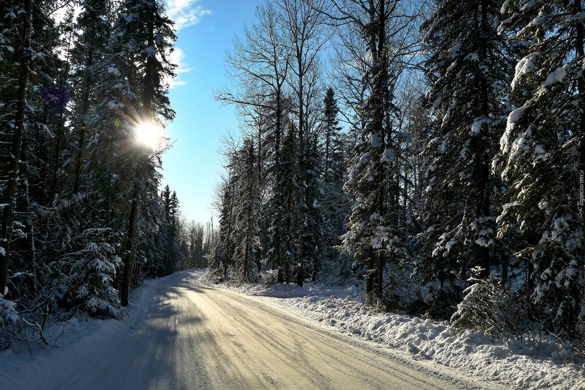 Edytor tapety: Promienie słońca na drzewach w zimowym lesie