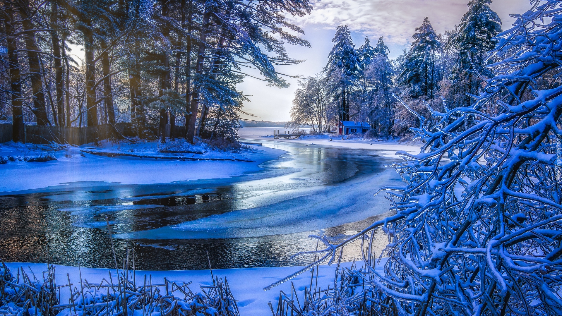 Edytor tapety: Dom nad rzeką w zimowym lesie