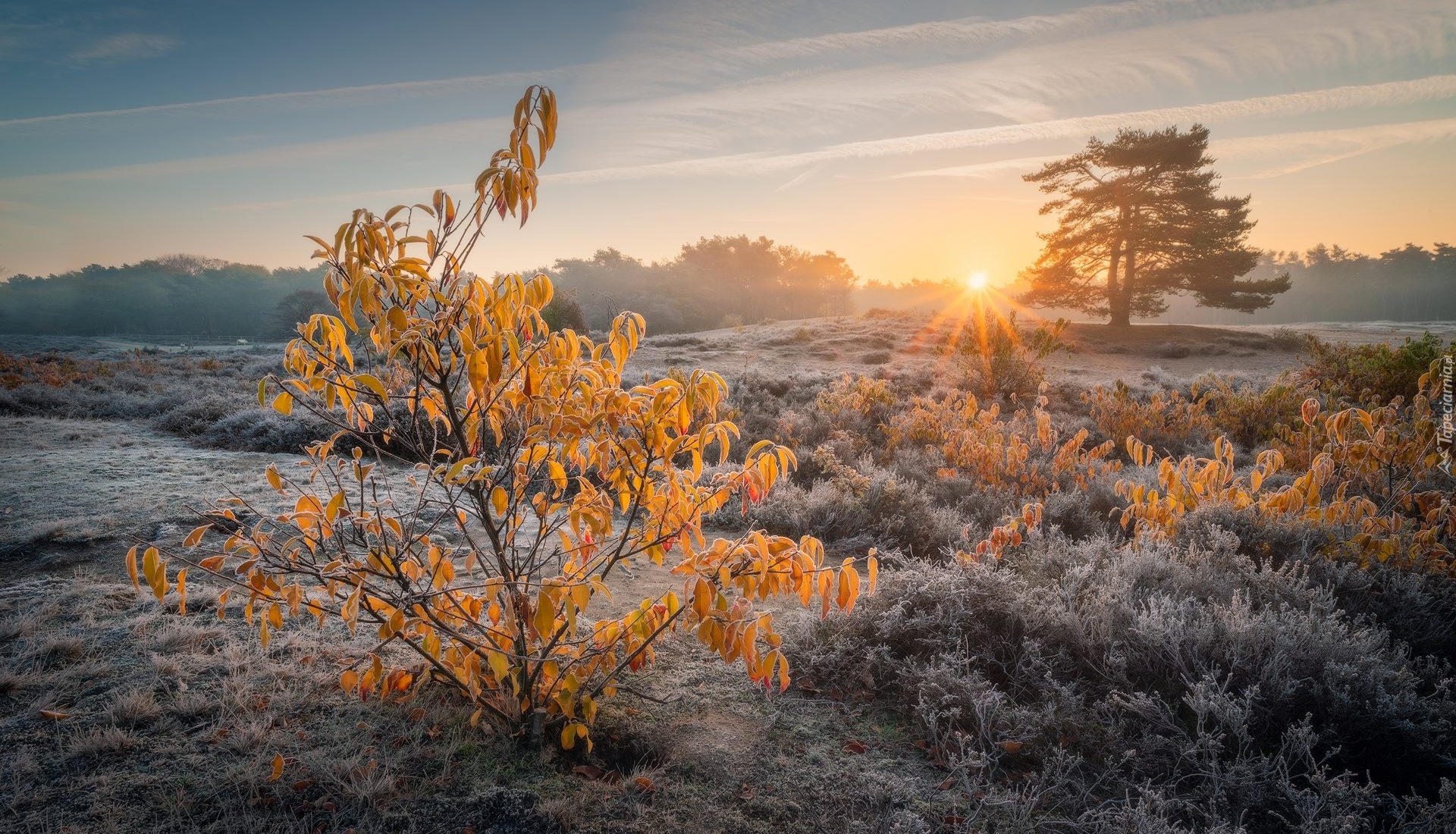 Edytor tapety: Oszronione krzewy o wschodzie słońca