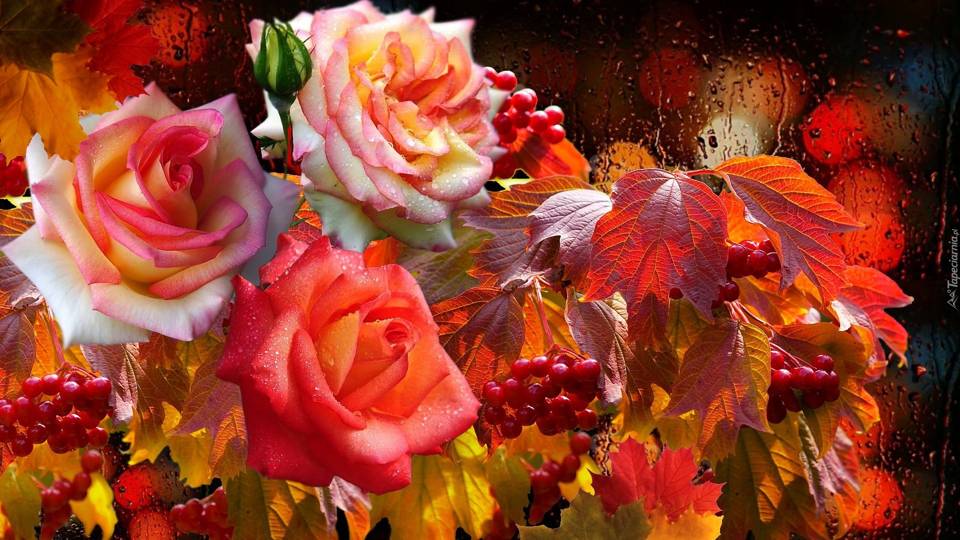 Edytor tapety: Trzy róże obok liści