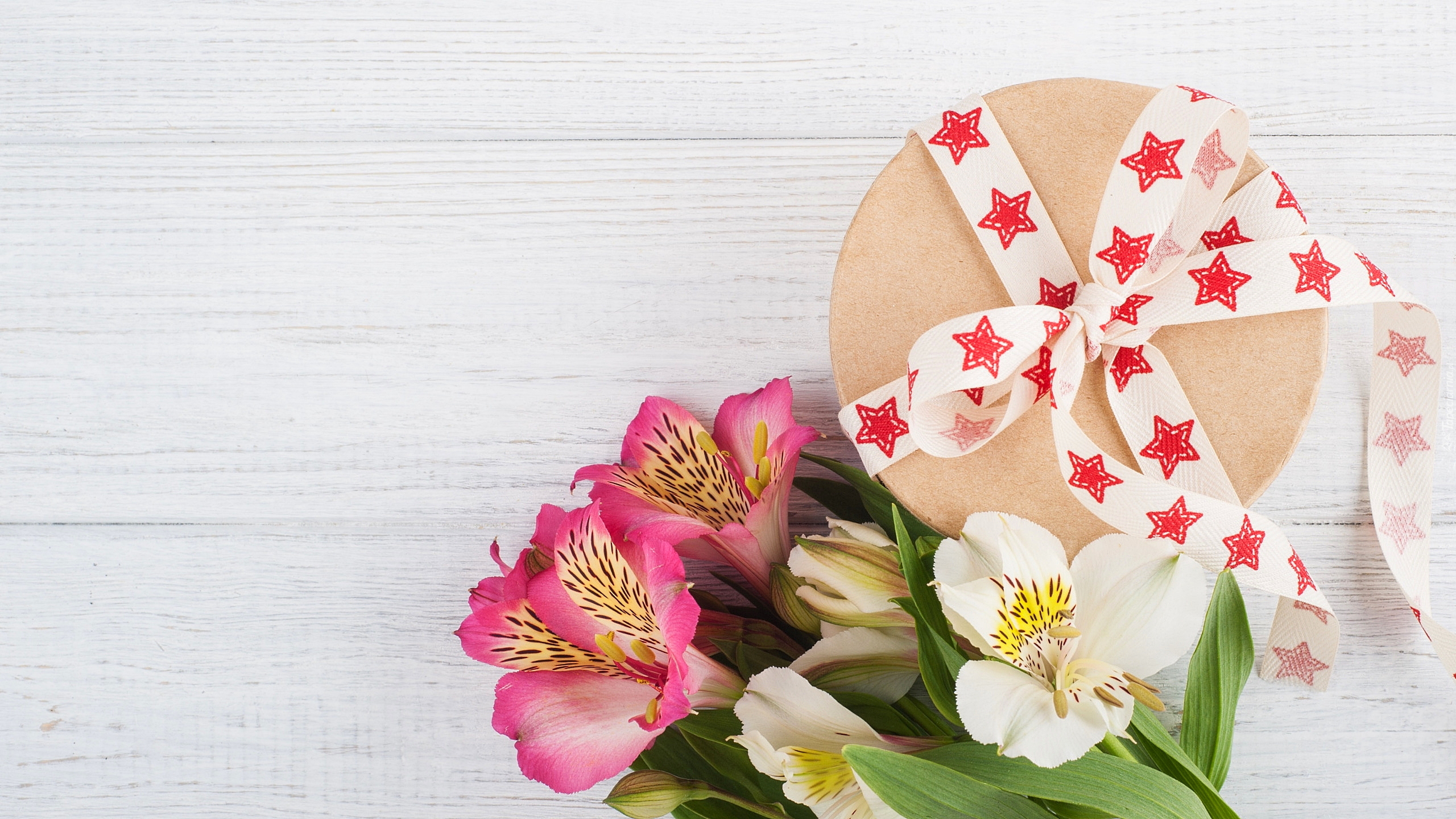 Edytor tapety: Alstremerie obok pudełka ze wstążką