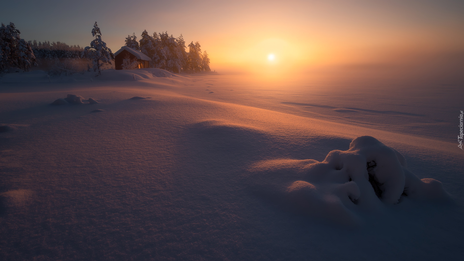 Edytor tapety: Wschód słońca nad zamglonym i zaśnieżonym jeziorem