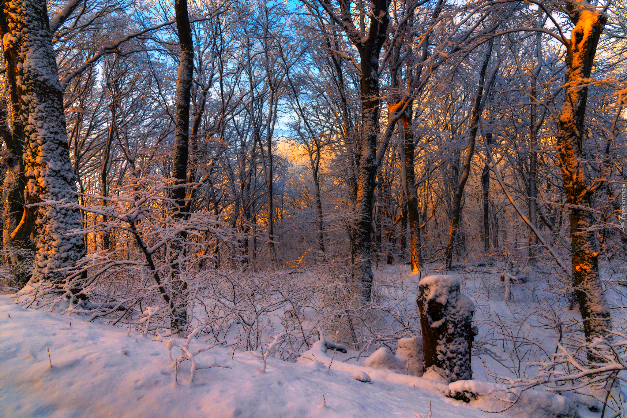 Edytor tapety: Ośnieżony las w blasku zachodzącego słońca