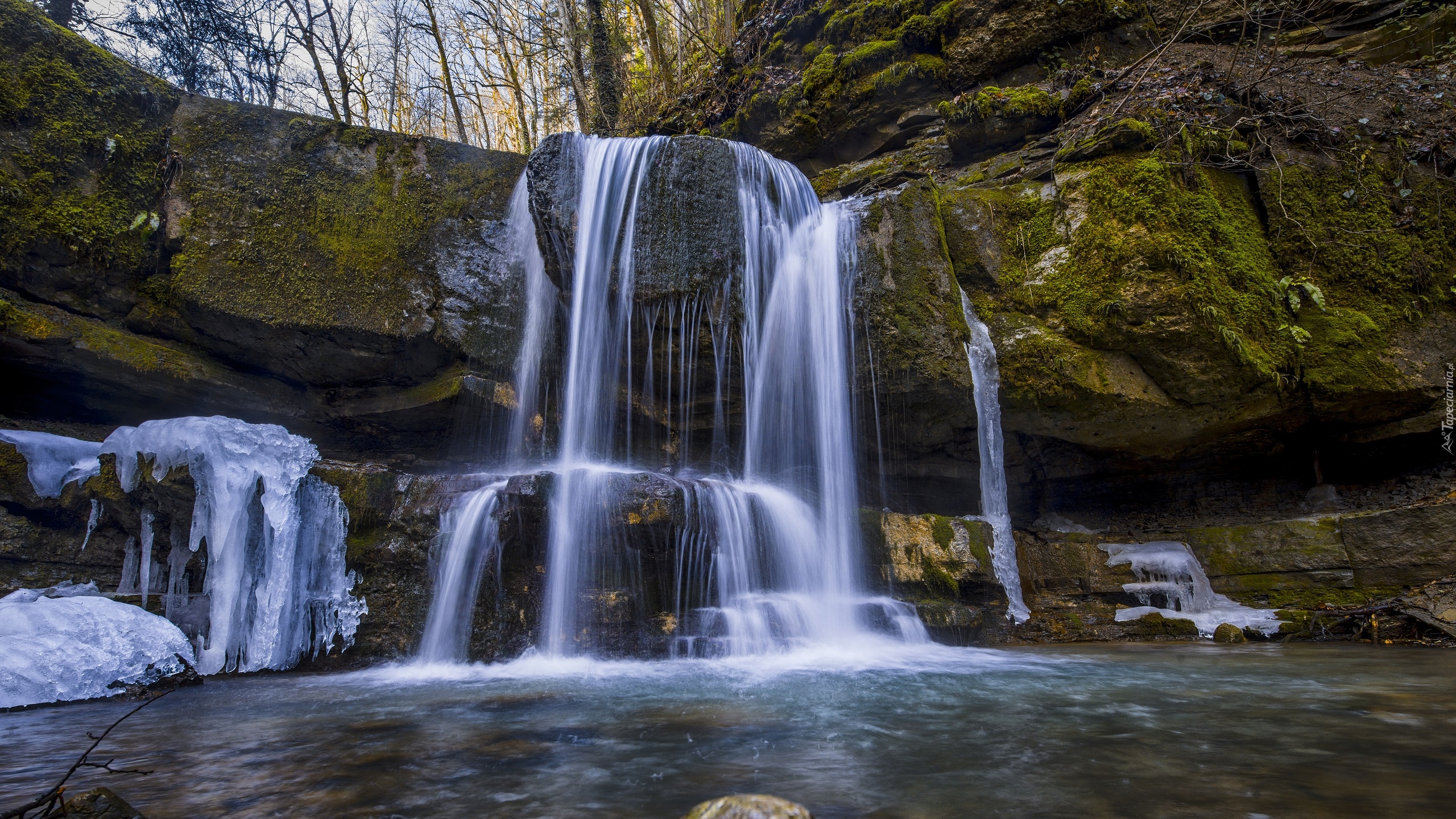 Edytor tapety: Śnieg na skałach obok małego wodospadu