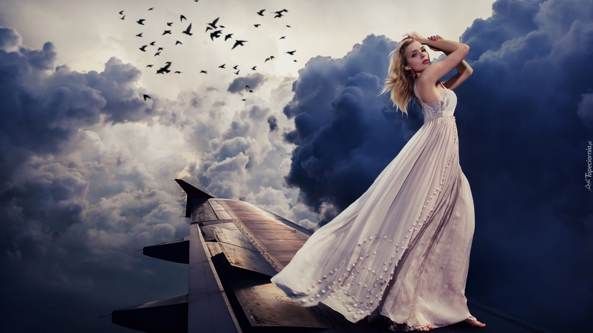Edytor tapety: Kobieta w białej sukni na skrzydle samolotu